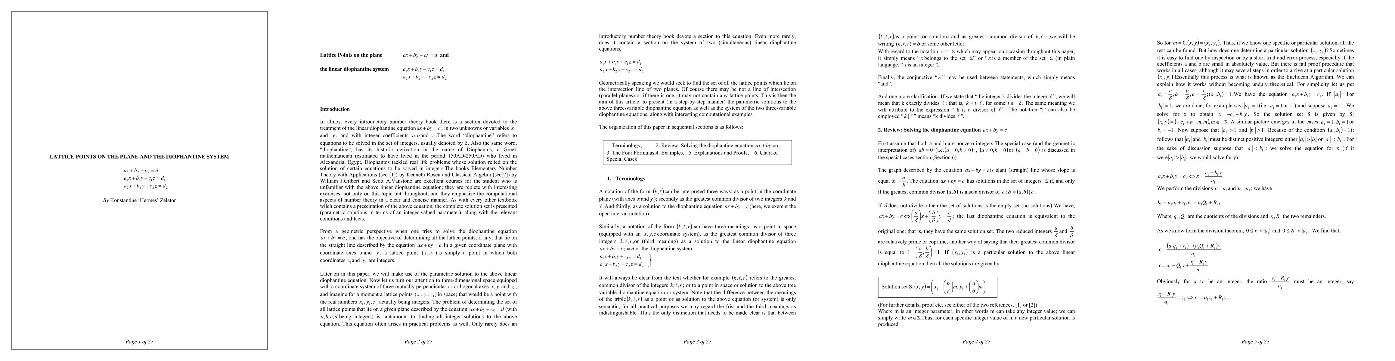 The subject matter of this work are the linear, three variable diophantine equation ax+by+cz=d (1), and the diophantine system ax+by+cz=d (2) ex+fy+gz=h with the coefficients a,b,c,d,e,f,g,h being integers. Introductory number theory books, typically contain only a brief outline of how to solve equation (1). Even less or no material is offered on the system (2). The purpose of this work is to fill this gap. After some preliminary, introductory material, which includes the general solution of the two variable linear diophantine equation ax+by=c(material which we use later in the paper); we present a complete and detailed analysis of equation (1). We determine the precise conditions that the coefficients a,b,c,d must satisfy in order for integer solutions to exist. We then derive a two-parameter, parametric description of The solution set. The solution set of (1), if not empty, consists of all integer triples (x,y,z) that satisfy (1). Geometrically, this is interpreted as the set of all lattice points in 3-D space which lie on the plane with equation (1). Similarly, we offer an exhaustive analysis of the system (2) by determining the precise conditions that the coeffients must satisfy in order for integer solutions to exist. We offer seven examples with detailed solutions.