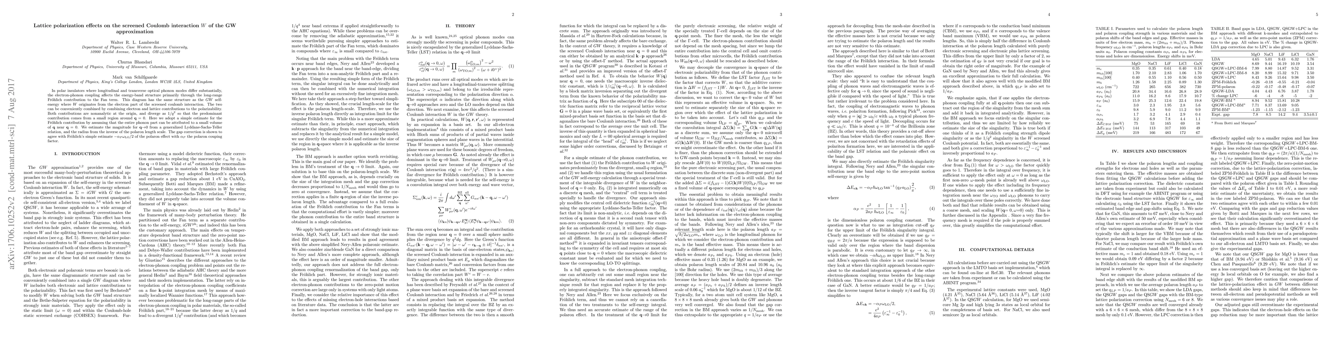 This paper investigates the impact of lattice polarization on the screened Coulomb interaction $W$ within the GW approximation, focusing on polar insulators. The study combines electron and lattice contributions to the polarizability, showing that the predominant effect comes from a small region around $q=0$, and validates the gap correction with Fr\"ohlich's polaron effect estimate.