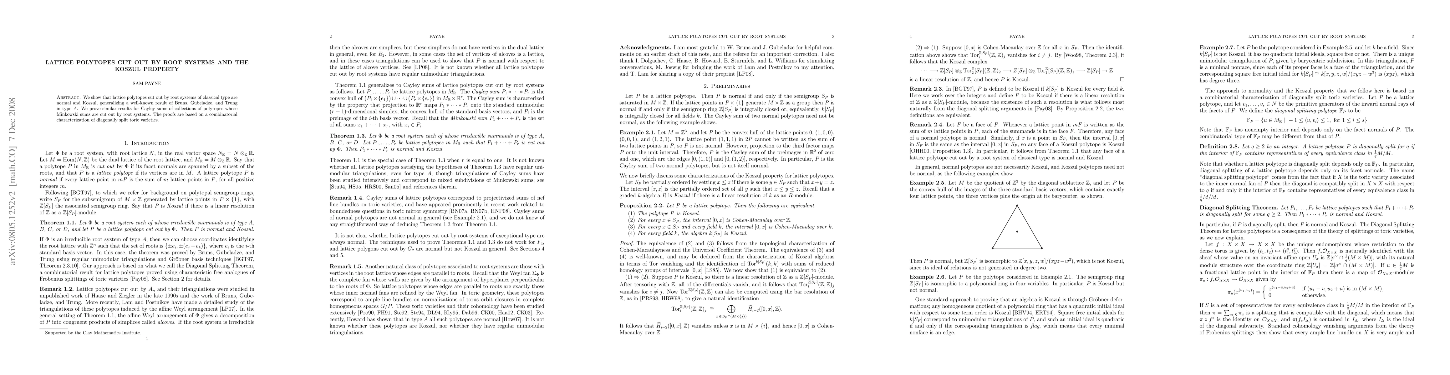 This paper demonstrates that lattice polytopes derived from classical root systems are both normal and Koszul, extending previous results for type A. It also proves similar properties for Cayley sums of polytopes, relying on a combinatorial approach to diagonally split toric varieties.