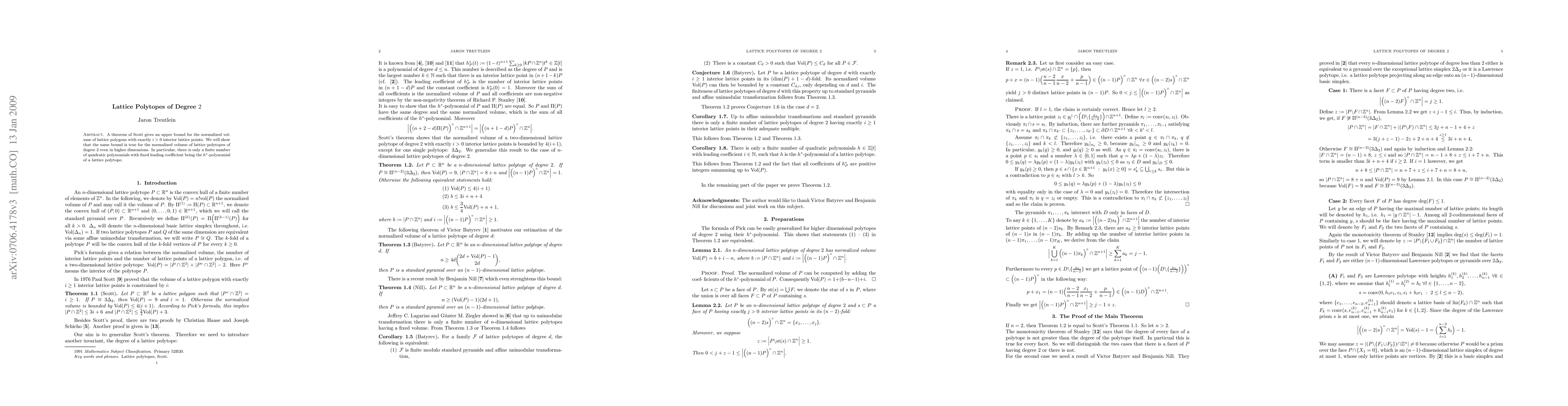 A theorem of Scott gives an upper bound for the normalized volume of lattice polygons with exactly $i>0$ interior lattice points. We will show that the same bound is true for the normalized volume of lattice polytopes of degree 2 even in higher dimensions. In particular, there is only a finite number of quadratic polynomials with fixed leading coefficient being the $h^*$-polynomial of a lattice polytope.
