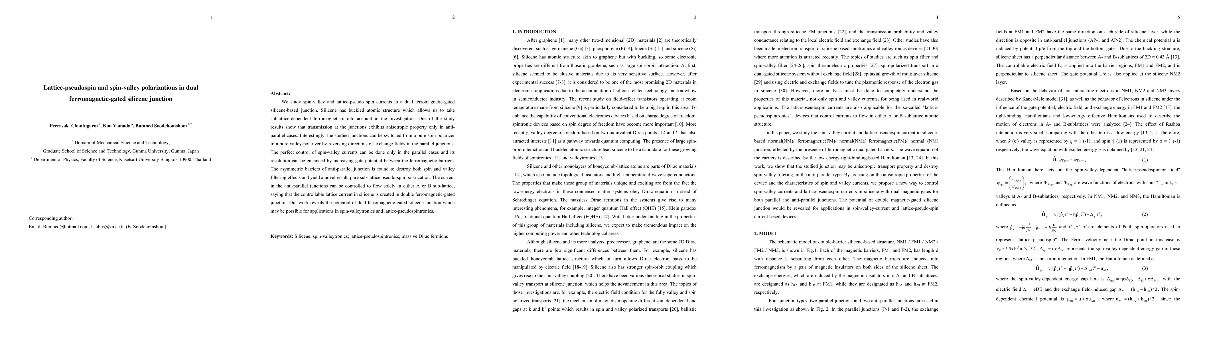 We study spin-valley and lattice-pseudo spin currents in a dual ferromagnetic-gated silicene-based junction. Silicene has buckled atomic structure which allows us to take sublattice-dependent ferromagnetism into account in the investigation. One of the study results show that transmission at the junctions exhibits anisotropic property only in anti-parallel cases. Interestingly, the studied junctions can be switched from a pure spin-polarizer to a pure valley-polarizer by reversing directions of exchange fields in the parallel junctions. The perfect control of spin-valley currents can be done only in the parallel cases and its resolution can be enhanced by increasing gate potential between the ferromagnetic barriers. The asymmetric barriers of anti-parallel junction is found to destroy both spin and valley filtering effects and yield a novel result, pure sub-lattice pseudo-spin polarization. The current in the anti-parallel junctions can be controlled to flow solely in either A or B sub-lattice, saying that the controllable lattice current in silicene is created in double ferromagnetic-gated junction. Our work reveals the potential of dual ferromagnetic-gated silicene junction which may be possible for applications in spin-valleytronics and lattice-pseudospintronics.