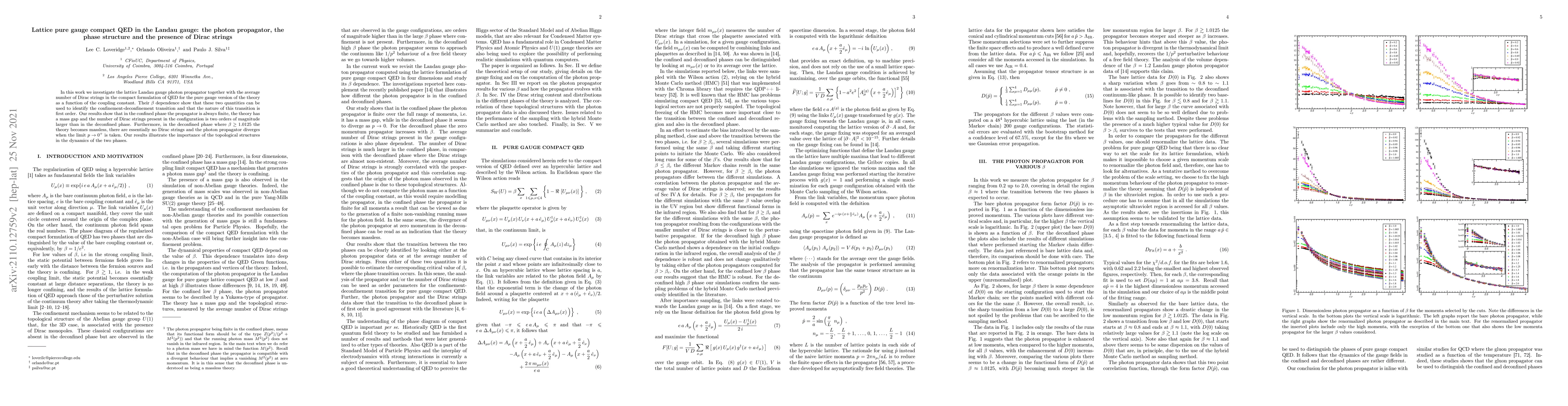 In this work we investigate the lattice Landau gauge photon propagator together with the average number of Dirac strings in the compact formulation of QED for the pure gauge version of the theory as a function of the coupling constant. Their $\beta$ dependence show that these two quantities can be used to identify the confinement-deconfinement transition and that the nature of this transition is first order. Our results show that in the confined phase the propagator is always finite, the theory has a mass gap and the number of Dirac strings present in the configuration is two orders of magnitude larger than in the deconfined phase. Furthermore, in the deconfined phase where $ \beta \ge 1.0125$ the theory becomes massless, there are essentially no Dirac strings and the photon propagator diverges when the limit $p \rightarrow 0^+$ is taken. Our results illustrate the importance of the topological structures in the dynamics of the two phases.
