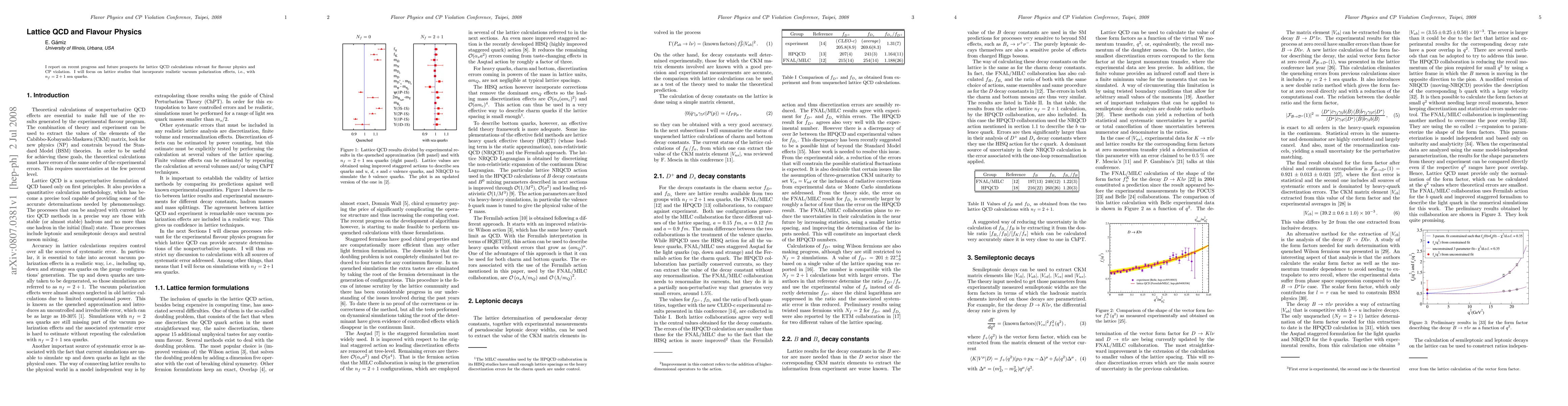 This work distinguishes itself by focusing on lattice studies that include n_f=2+1 sea quarks and realistic vacuum polarization effects, providing more accurate calculations of decay constants and form factors relevant for flavour physics and CP violation.