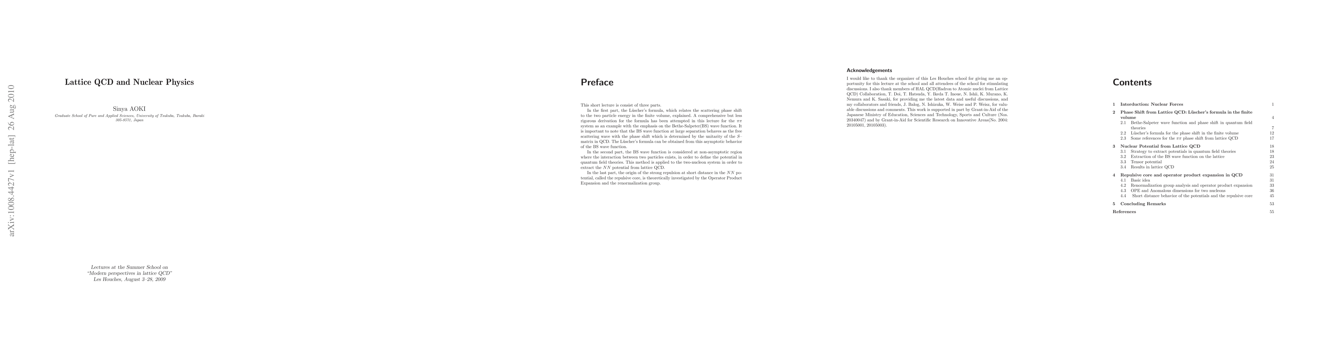 Summary: This lecture explores the application of lattice Quantum Chromodynamics (QCD) to nuclear physics, highlighting its role in understanding the strong force interactions and the behavior of nucleons within atomic nuclei. The presentation was part of a summer school focusing on modern advancements in lattice QCD.