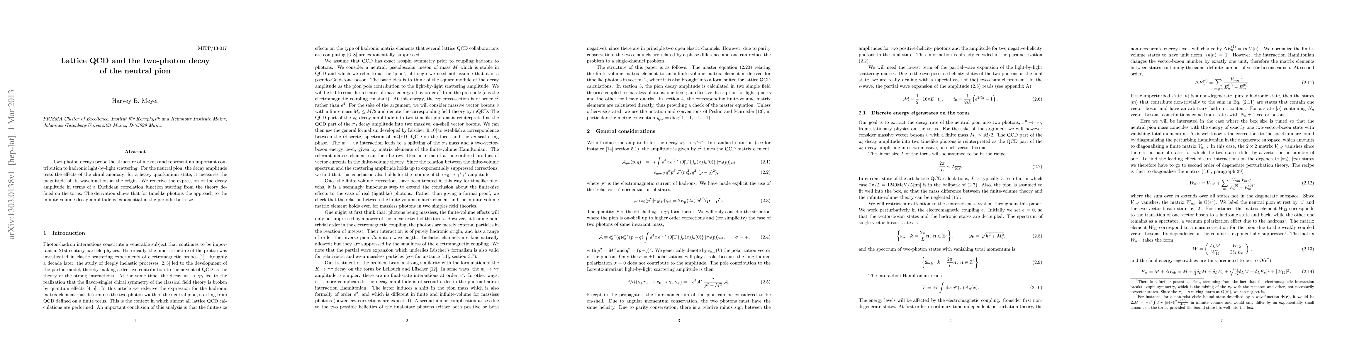 Two-photon decays probe the structure of mesons and represent an important contribution to hadronic light-by-light scattering. For the neutral pion, the decay amplitude tests the effects of the chiral anomaly; for a heavy quarkonium state, it measures the magnitude of its wavefunction at the origin. We rederive the expression of the decay amplitude in terms of a Euclidean correlation function starting from the theory defined on the torus. The derivation shows that for timelike photons the approach to the infinite-volume decay amplitude is exponential in the periodic box size.