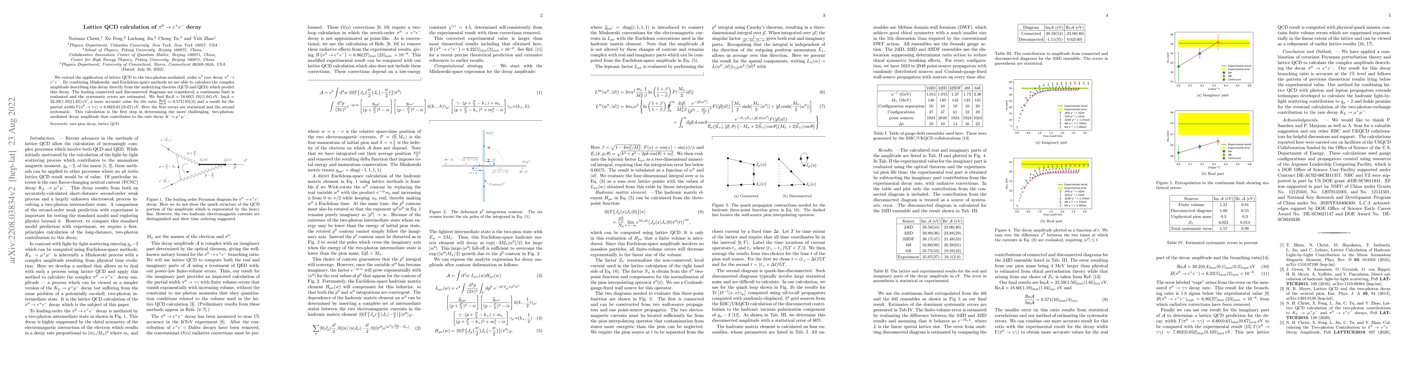 This paper presents a lattice QCD calculation for the rare decay $\pi^0\rightarrow e^+ e^-$, determining the complex amplitude and partial width. The study combines Minkowski- and Euclidean-space methods to achieve a more accurate ratio of real to imaginary parts and estimates systematic errors.