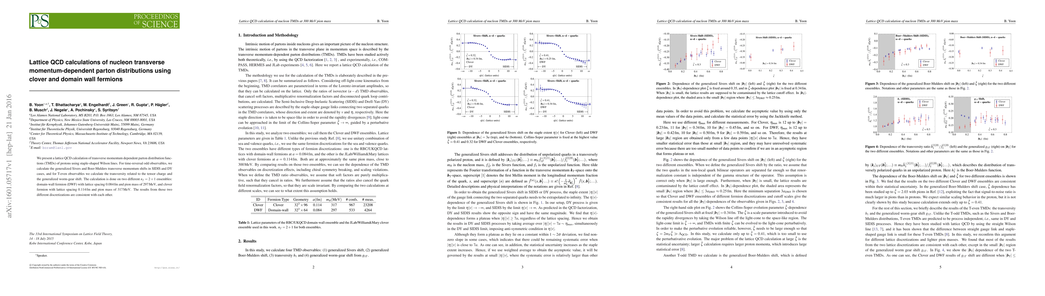 This paper reports lattice QCD calculations of nucleon transverse momentum-dependent parton distributions using staple-shaped Wilson lines and two different fermion types: domain-wall and clover fermions. Results for both time-reversal odd and even observables are consistent across the two ensembles.