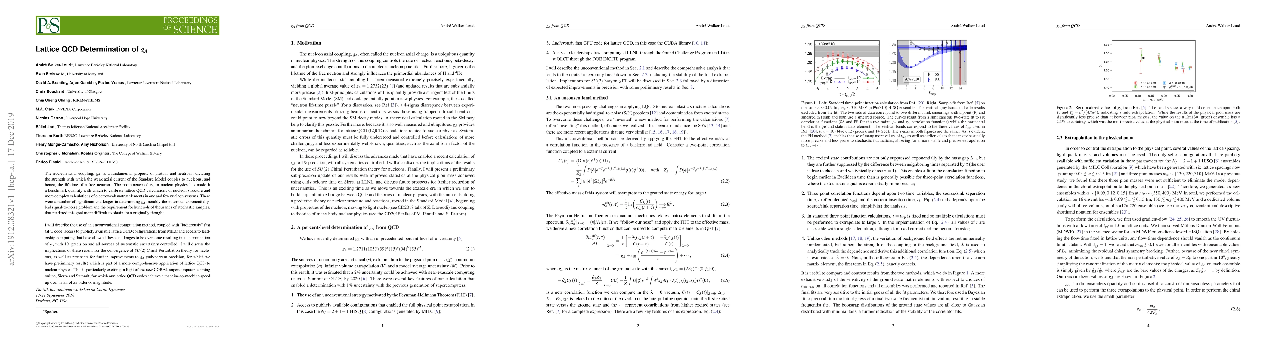 The nucleon axial coupling, $g_A$, is a fundamental property of protons and neutrons, dictating the strength with which the weak axial current of the Standard Model couples to nucleons, and hence, the lifetime of a free neutron. The prominence of $g_A$ in nuclear physics has made it a benchmark quantity with which to calibrate lattice QCD calculations of nucleon structure and more complex calculations of electroweak matrix elements in one and few nucleon systems. There were a number of significant challenges in determining $g_A$, notably the notorious exponentially-bad signal-to-noise problem and the requirement for hundreds of thousands of stochastic samples, that rendered this goal more difficult to obtain than originally thought. I will describe the use of an unconventional computation method, coupled with "ludicrously'" fast GPU code, access to publicly available lattice QCD configurations from MILC and access to leadership computing that have allowed these challenges to be overcome resulting in a determination of $g_A$ with 1% precision and all sources of systematic uncertainty controlled. I will discuss the implications of these results for the convergence of $SU(2)$ Chiral Perturbation theory for nucleons, as well as prospects for further improvements to $g_A$ (sub-percent precision, for which we have preliminary results) which is part of a more comprehensive application of lattice QCD to nuclear physics. This is particularly exciting in light of the new CORAL supercomputers coming online, Sierra and Summit, for which our lattice QCD codes achieve a machine-to-machine speed up over Titan of an order of magnitude.