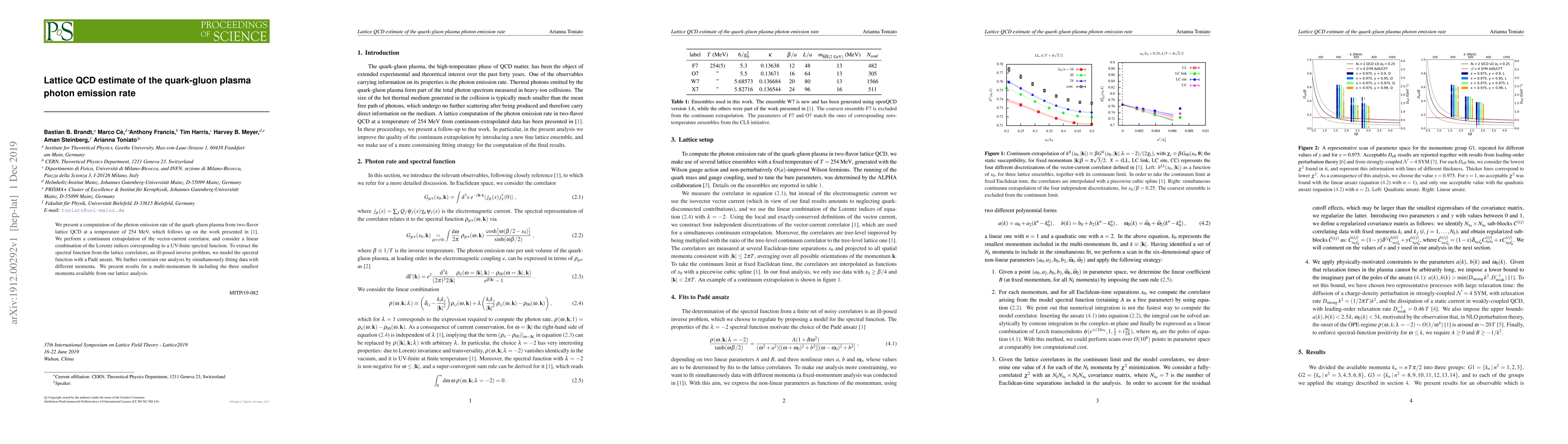 We present a computation of the photon emission rate of the quark-gluon plasma from two-flavor lattice QCD at a temperature of 254 MeV, which follows up on the work presented in [1]. We perform a continuum extrapolation of the vector-current correlator, and consider a linear combination of the Lorentz indices corresponding to a UV-finite spectral function. To extract the spectral function from the lattice correlators, an ill-posed inverse problem, we model the spectral function with a Pad\'e ansatz. We further constrain our analysis by simultaneously fitting data with different momenta. We present results for a multi-momentum fit including the three smallest momenta available from our lattice analysis.