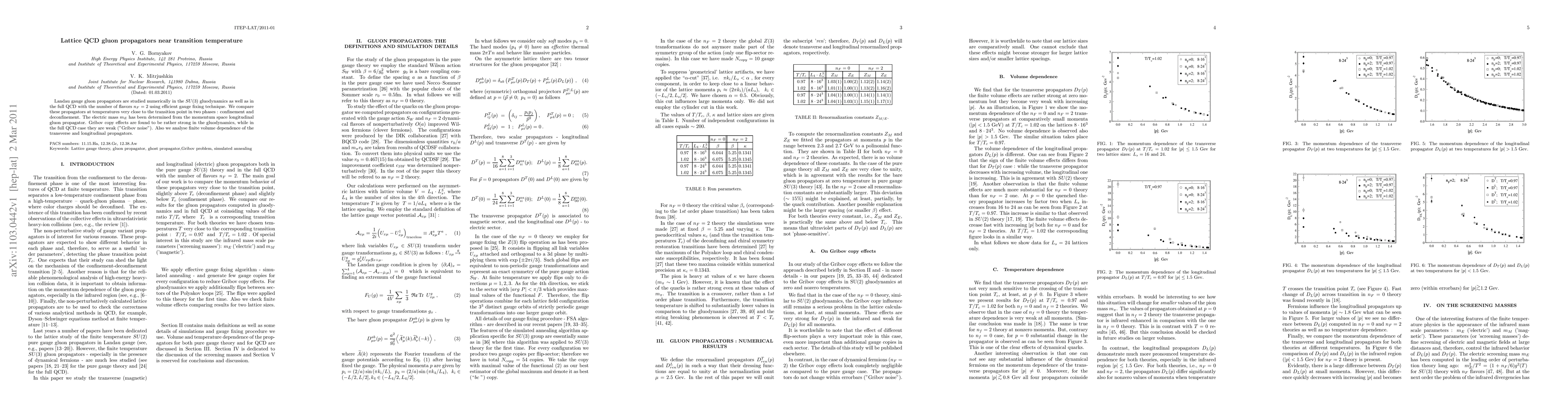 Landau gauge gluon propagators are studied numerically in the SU(3) gluodynamics as well as in the full QCD with the number of flavors $n_F=2$ using efficient gauge fixing technique. We compare these propagators at temperatures very close to the transition point in two phases : confinement and deconfinement. The electric mass $m_E$ has been determined from the momentum space longitudinal gluon propagator. Gribov copy effects are found to be rather strong in the gluodynamics, while in the full QCD case they are weak ("Gribov noise"). Also we analyse finite volume dependence of the transverse and longitudinal propagators.
