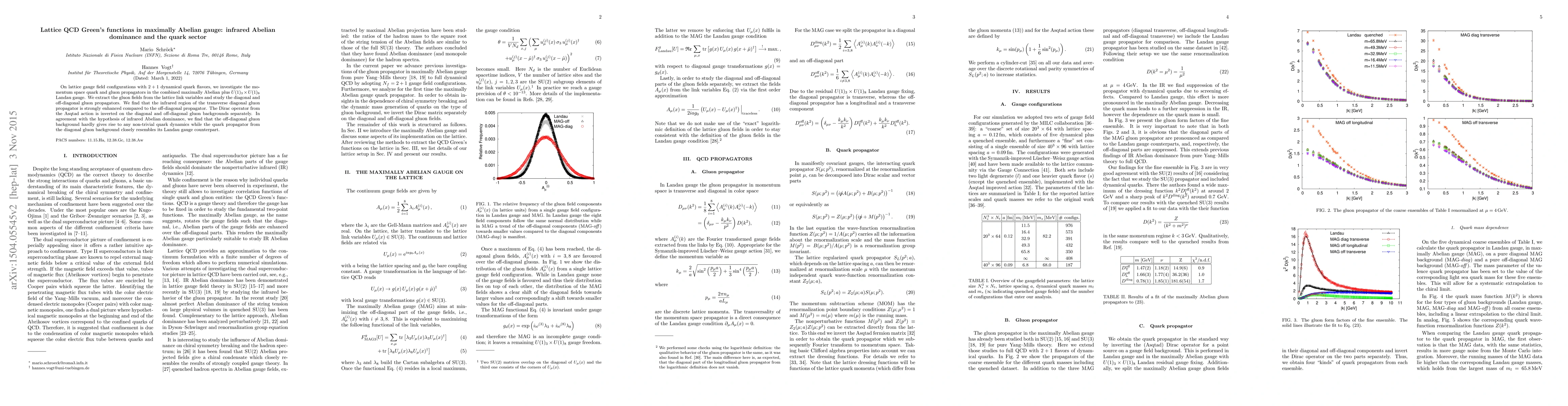 On lattice gauge field configurations with 2+1 dynamical quark flavors, we investigate the momentum space quark and gluon propagators in the combined maximally Abelian plus $U(1)_3\times U(1)_8$ Landau gauge. We extract the gluon fields from the lattice link variables and study the diagonal and off-diagonal gluon propagators. We find that the infrared region of the transverse diagonal gluon propagator is strongly enhanced compared to the off-diagonal propagator. The Dirac operator from the Asqtad action is inverted on the diagonal and off-diagonal gluon backgrounds separately. In agreement with the hypothesis of infrared Abelian dominance, we find that the off-diagonal gluon background hardly gives rise to any non-trivial quark dynamics while the quark propagator from the diagonal gluon background closely resembles its Landau gauge counterpart.