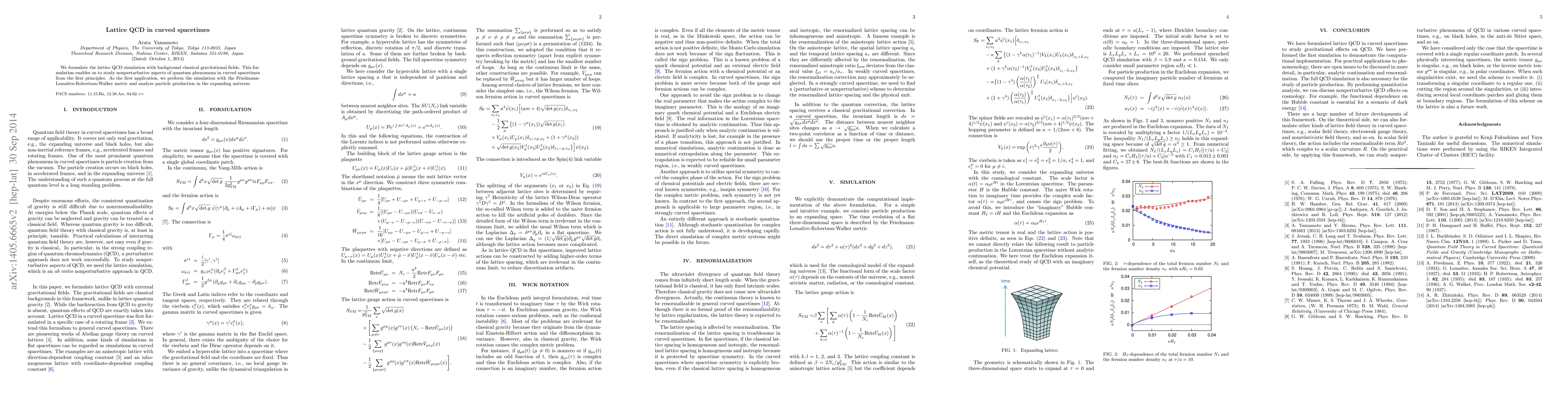 We formulate the lattice QCD simulation with background classical gravitational fields. This formulation enables us to study nonperturbative aspects of quantum phenomena in curved spacetimes from the first principles. As the first application, we perform the simulation with the Friedmann-Lemaitre-Robertson-Walker metric and analyze particle production in the expanding universe.