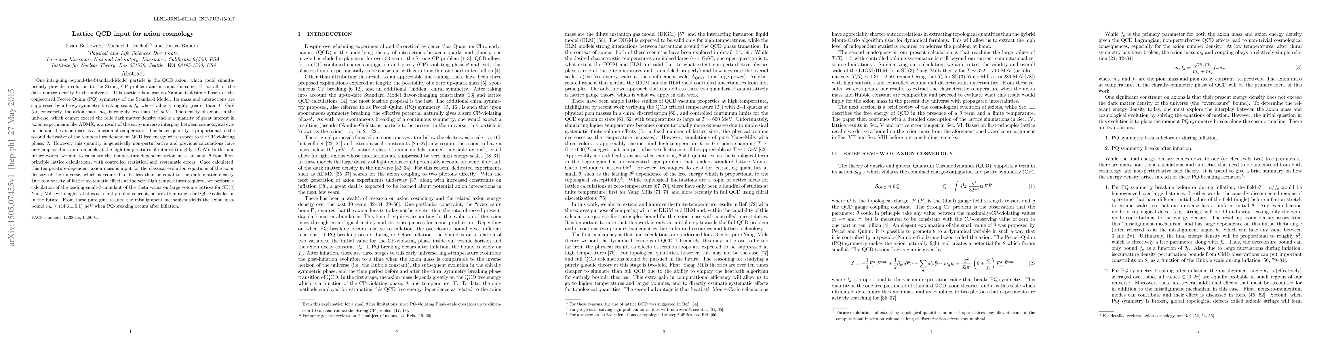 One intriguing BSM particle is the QCD axion, which could simultaneously provide a solution to the Strong CP problem and account for some, if not all, of the dark matter density in the universe. This particle is a pNGB of the conjectured Peccei-Quinn (PQ) symmetry of the Standard Model. Its mass and interactions are suppressed by a heavy symmetry breaking scale, $f_a$, whose value is roughly greater than $10^{9}$ GeV (or, conversely, the axion mass, $m_a$, is roughly less than $10^4\ \mu \text{eV}$). The density of axions in the universe, which cannot exceed the relic dark matter density and is a quantity of great interest in axion experiments like ADMX, is a result of the early-universe interplay between cosmological evolution and the axion mass as a function of temperature. The latter quantity is proportional to the second derivative of the QCD free energy with respect to the CP-violating phase, $\theta$. However, this quantity is generically non-perturbative and previous calculations have only employed instanton models at the high temperatures of interest (roughly 1 GeV). In this and future works, we aim to calculate the temperature-dependent axion mass at small $\theta$ from first-principle lattice calculations, with controlled statistical and systematic errors. Once calculated, this temperature-dependent axion mass is input for the classical evolution equations of the axion density of the universe. Due to a variety of lattice systematic effects at the very high temperatures required, we perform a calculation of the leading small-$\theta$ cumulant of the theta vacua on large volume lattices for SU(3) Yang-Mills with high statistics as a first proof of concept, before attempting a full QCD calculation in the future. From these pure glue results, the misalignment mechanism yields the axion mass bound $m_a \geq (14.6\pm0.1) \ \mu \text{eV}$ when PQ-breaking occurs after inflation.