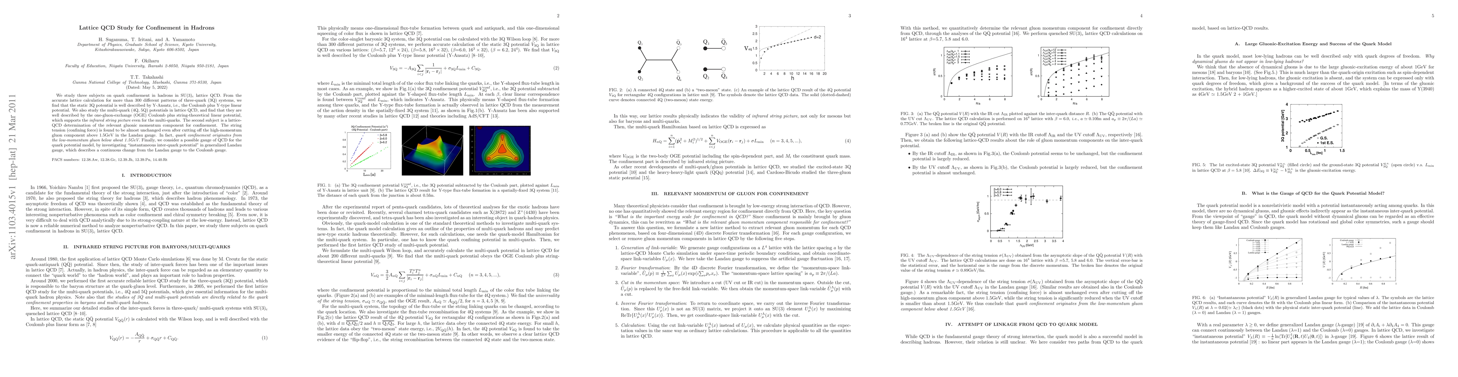 We study three subjects on quark confinement in hadrons in SU(3)$_{\rm c}$ lattice QCD. From the accurate lattice calculation for more than 300 different patterns of three-quark (3Q) systems, we find that the static 3Q potential is well described by Y-Ansatz, i.e., the Coulomb plus Y-type linear potential. We also study the multi-quark (4Q, 5Q) potentials in lattice QCD, and find that they are well described by the one-gluon-exchange (OGE) Coulomb plus string-theoretical linear potential, which supports the {\it infrared string picture} even for the multi-quarks. The second subject is a lattice-QCD determination of the relevant gluonic momentum component for confinement. The string tension (confining force) is found to be almost unchanged even after cutting off the high-momentum gluon component above 1.5GeV in the Landau gauge. In fact, {\it quark confinement originates from the low-momentum gluon below about 1.5GeV.} Finally, we consider a possible gauge of QCD for the quark potential model, by investigating "instantaneous inter-quark potential" in generalized Landau gauge, which describes a continuous change from the Landau gauge to the Coulomb gauge.