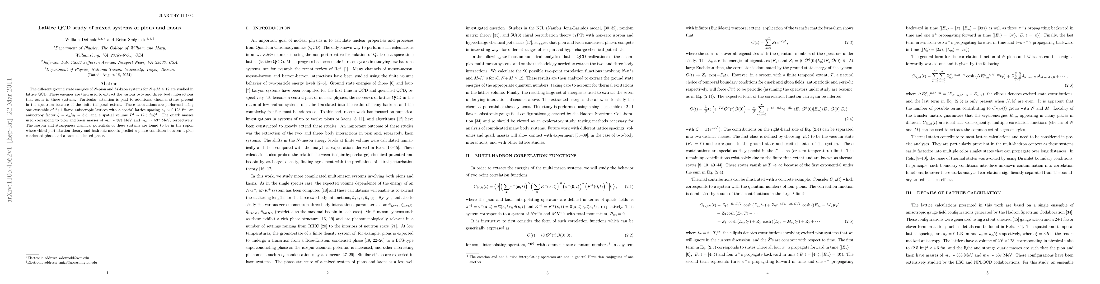 The different ground state energies of N-pion and M-kaon systems for N+M <=12 are studied in lattice QCD. These energies are then used to extract the various two- and three- body interactions that occur in these systems. Particular attention is paid to additional thermal states present in the spectrum because of the finite temporal extent. These calculations are performed using one ensemble of 2+1 flavor anisotropic lattices with a spatial lattice spacing a_s ~ 0.125 fm, an anisotropy factor {\xi}=a_s/a_t=3.5, and a spatial volume L^3 ~ (2.5 fm)^3. The quark masses used correspond to pion and kaon masses of m_{\pi} ~ 383 MeV and m_K ~ 537 MeV, respectively. The isospin and strangeness chemical potentials of these systems are found to be in the region where chiral perturbation theory and hadronic models predict a phase transition between a pion condensed phase and a kaon condensed phase.