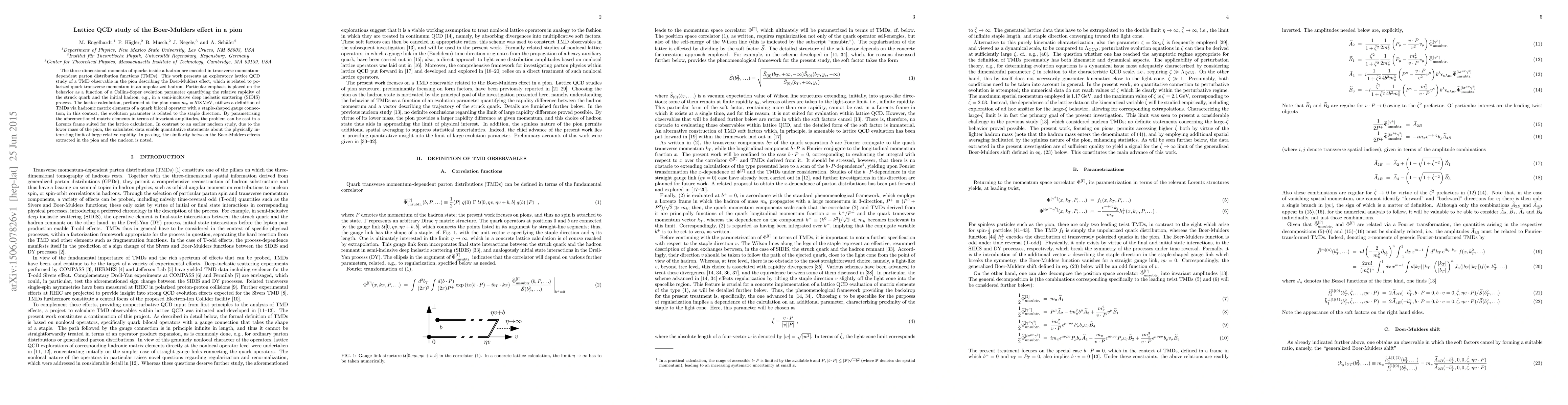 The three-dimensional momenta of quarks inside a hadron are encoded in transverse momentum-dependent parton distribution functions (TMDs). This work presents an exploratory lattice QCD study of a TMD observable in the pion describing the Boer-Mulders effect, which is related to polarized quark transverse momentum in an unpolarized hadron. Particular emphasis is placed on the behavior as a function of a Collins-Soper evolution parameter quantifying the relative rapidity of the struck quark and the initial hadron, e.g., in a semi-inclusive deep inelastic scattering (SIDIS) process. The lattice calculation, performed at the pion mass m_pi = 518 MeV, utilizes a definition of TMDs via hadronic matrix elements of a quark bilocal operator with a staple-shaped gauge connection; in this context, the evolution parameter is related to the staple direction. By parametrizing the aforementioned matrix elements in terms of invariant amplitudes, the problem can be cast in a Lorentz frame suited for the lattice calculation. In contrast to an earlier nucleon study, due to the lower mass of the pion, the calculated data enable quantitative statements about the physically interesting limit of large relative rapidity. In passing, the similarity between the Boer-Mulders effects extracted in the pion and the nucleon is noted.