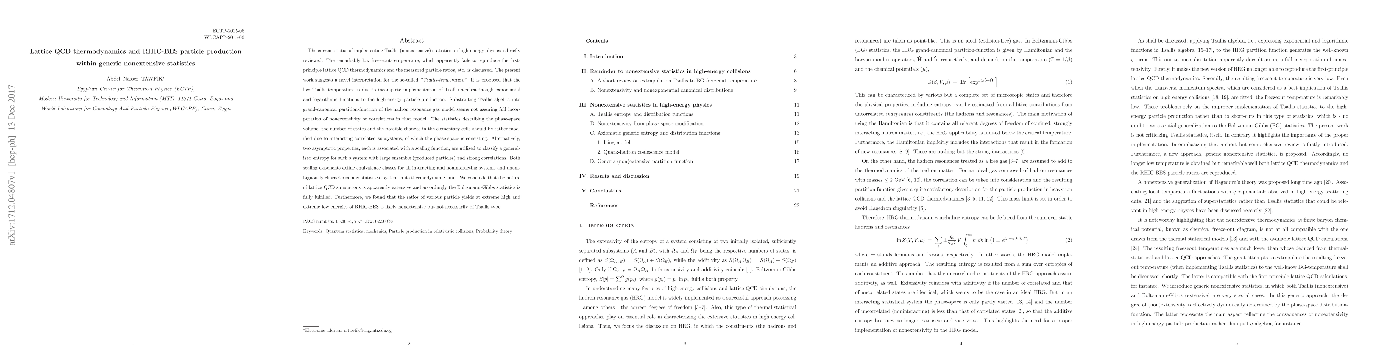 This paper reviews the application of Tsallis (nonextensive) statistics in high-energy physics, suggesting that the low freezeout temperature observed in RHIC-BES does not align with lattice QCD thermodynamics. The authors propose that the low Tsallis-temperature results from incomplete implementation of Tsallis algebra, and suggest a generalized entropy approach to better describe particle production in high-energy collisions.
