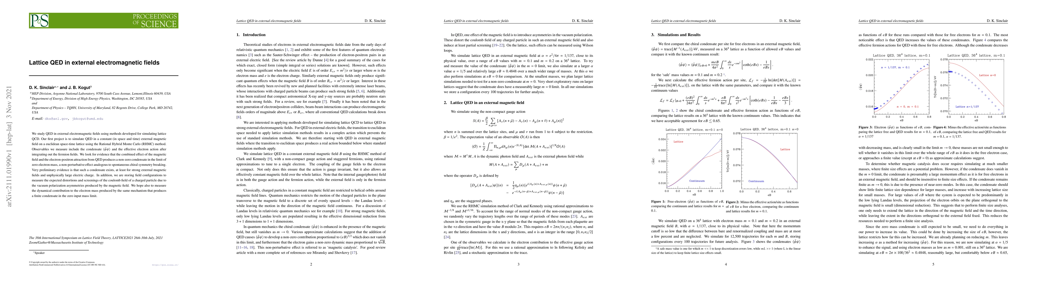 We study QED in external electromagnetic fields using methods developed for simulating lattice QCD. Our first project is to simulate QED in a constant (in space and time) external magnetic field on a euclidean space-time lattice using the Rational Hybrid Monte Carlo (RHMC) method. Observables we measure include the condensate $\langle\bar{\psi}\psi\rangle$ and the effective electron action after integrating out the fermion fields. We look for evidence that the combined effect of the magnetic field and the electron-positron attraction from QED produces a non-zero condensate in the limit of zero electron mass, a non-perturbative effect analogous to spontaneous chiral symmetry breaking. Very preliminary evidence is that such a condensate exists, at least for strong external magnetic fields and unphysically large electric charge. In addition, we are storing field configurations to measure the expected distortions and screenings of the coulomb field of a charged particle due to the vacuum polarization asymmetries produced by the magnetic field. We hope also to measure the dynamical contribution to the electron mass produced by the same mechanism that produces a finite condensate in the zero input mass limit.