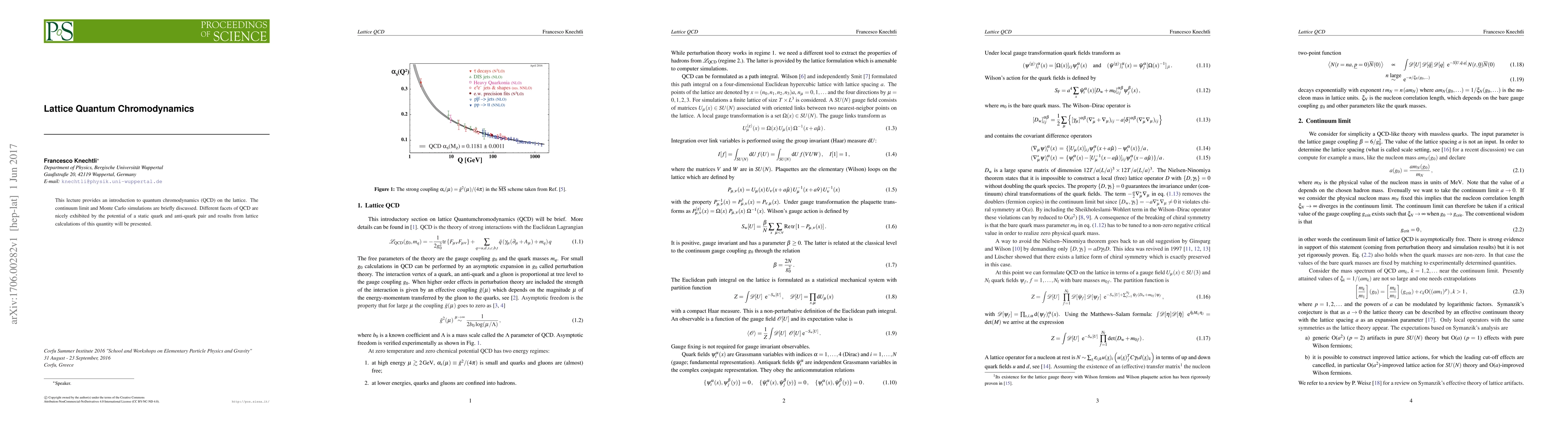 This lecture introduces lattice quantum chromodynamics (QCD), focusing on the continuum limit and Monte Carlo simulations. It presents lattice calculations of the potential between a static quark and anti-quark pair, showcasing various QCD aspects.