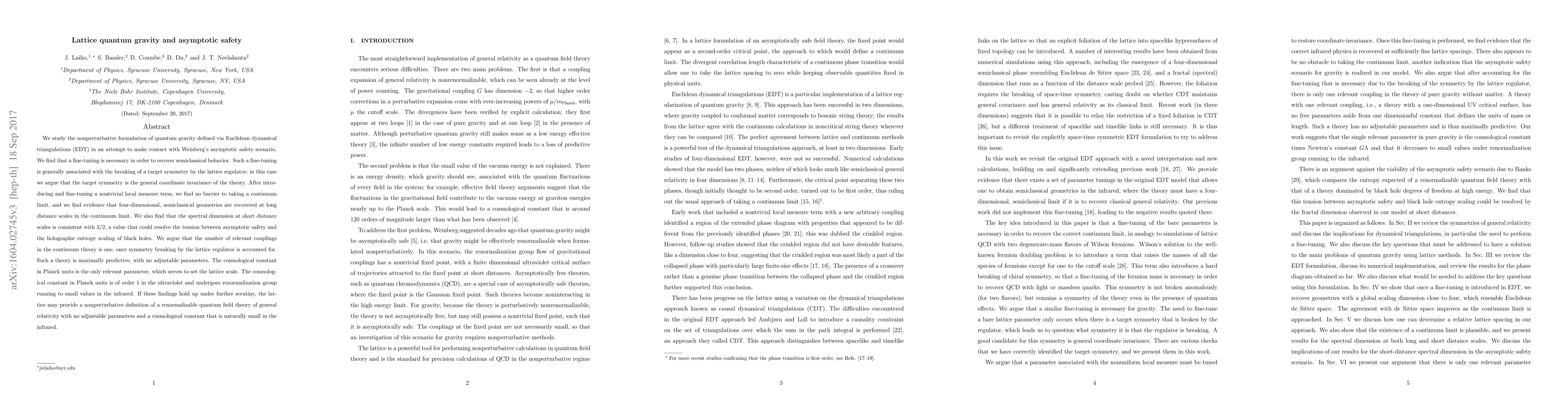 We study the nonperturbative formulation of quantum gravity defined via Euclidean dynamical triangulations (EDT) in an attempt to make contact with Weinberg's asymptotic safety scenario. We find that a fine-tuning is necessary in order to recover semiclassical behavior. Such a fine-tuning is generally associated with the breaking of a target symmetry by the lattice regulator; in this case we argue that the target symmetry is the general coordinate invariance of the theory. After introducing and fine-tuning a nontrivial local measure term, we find no barrier to taking a continuum limit, and we find evidence that four-dimensional, semiclassical geometries are recovered at long distance scales in the continuum limit. We also find that the spectral dimension at short distance scales is consistent with 3/2, a value that could resolve the tension between asymptotic safety and the holographic entropy scaling of black holes. We argue that the number of relevant couplings in the continuum theory is one, once symmetry breaking by the lattice regulator is accounted for. Such a theory is maximally predictive, with no adjustable parameters. The cosmological constant in Planck units is the only relevant parameter, which serves to set the lattice scale. The cosmological constant in Planck units is of order 1 in the ultraviolet and undergoes renormalization group running to small values in the infrared. If these findings hold up under further scrutiny, the lattice may provide a nonperturbative definition of a renormalizable quantum field theory of general relativity with no adjustable parameters and a cosmological constant that is naturally small in the infrared.