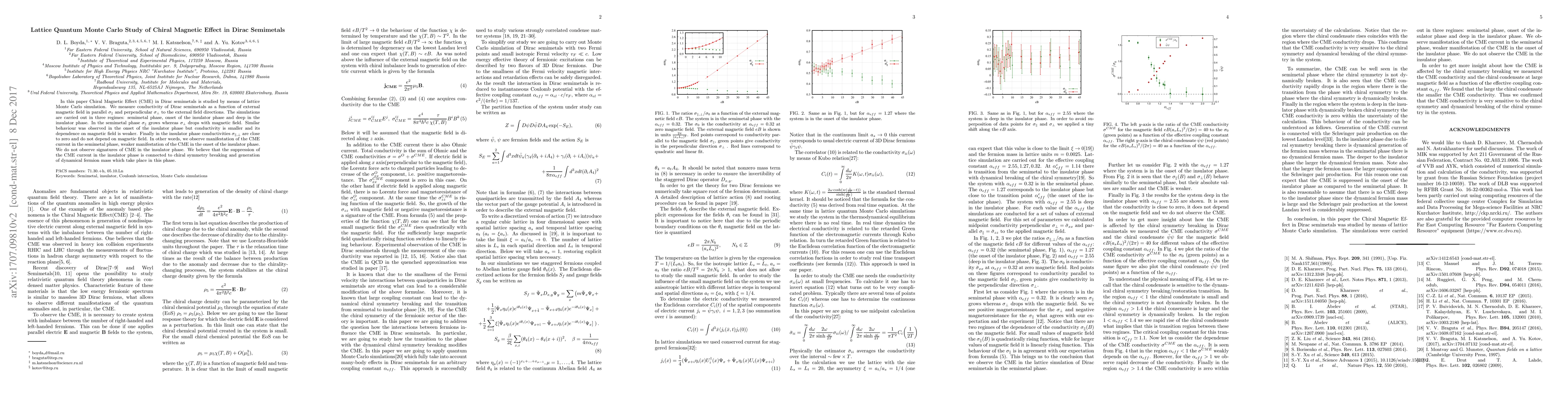 In this paper Chiral Magnetic Effect (CME) in Dirac semimetals is studied by means of lattice Monte Carlo simulation. We measure conductivity of Dirac semimetals as a function of external magnetic field in parallel $\sigma_{\parallel}$ and perpendicular $\sigma_{\perp}$ to the external field directions. The simulations are carried out in three regimes: semimetal phase, onset of the insulator phase and deep in the insulator phase. In the semimetal phase $\sigma_{\parallel}$ grows whereas $\sigma_{\perp}$ drops with magnetic field. Similar behaviour was observed in the onset of the insulator phase but conductivity is smaller and its dependence on magnetic field is weaker. Finally in the insulator phase conductivities $\sigma_{\parallel, \perp}$ are close to zero and do not depend on magnetic field. In other words, we observe manifestation of the CME current in the semimetal phase, weaker manifestation of the CME in the onset of the insulator phase. We do not observe signatures of CME in the insulator phase. We believe that the suppression of the CME current in the insulator phase is connected to chiral symmetry breaking and generation of dynamical fermion mass which take place in this phase.