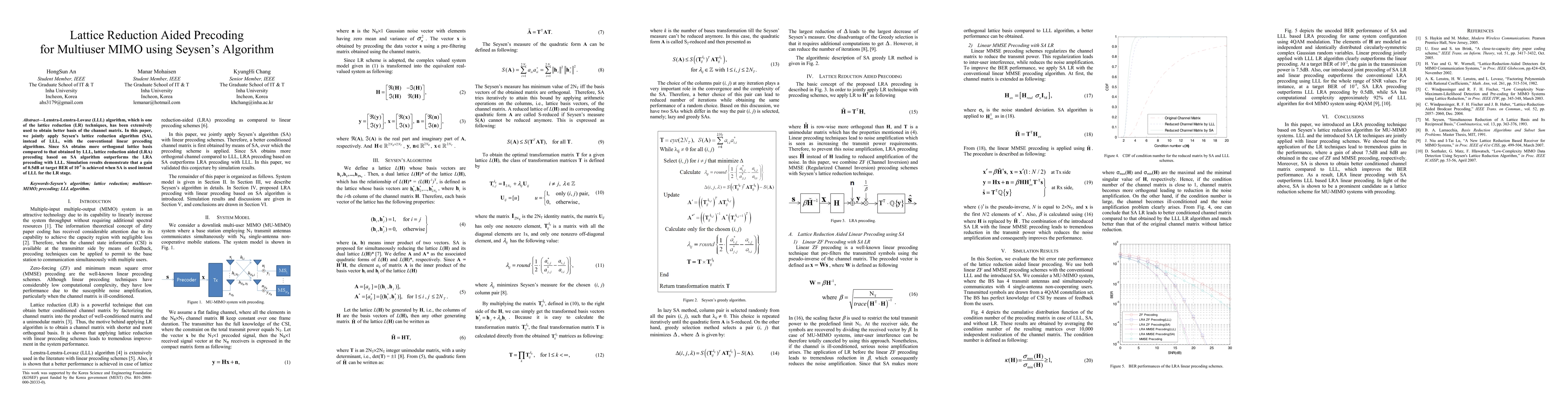 Seysen's lattice reduction algorithm is used to improve the performance of LRA precoding in multiuser MIMO systems