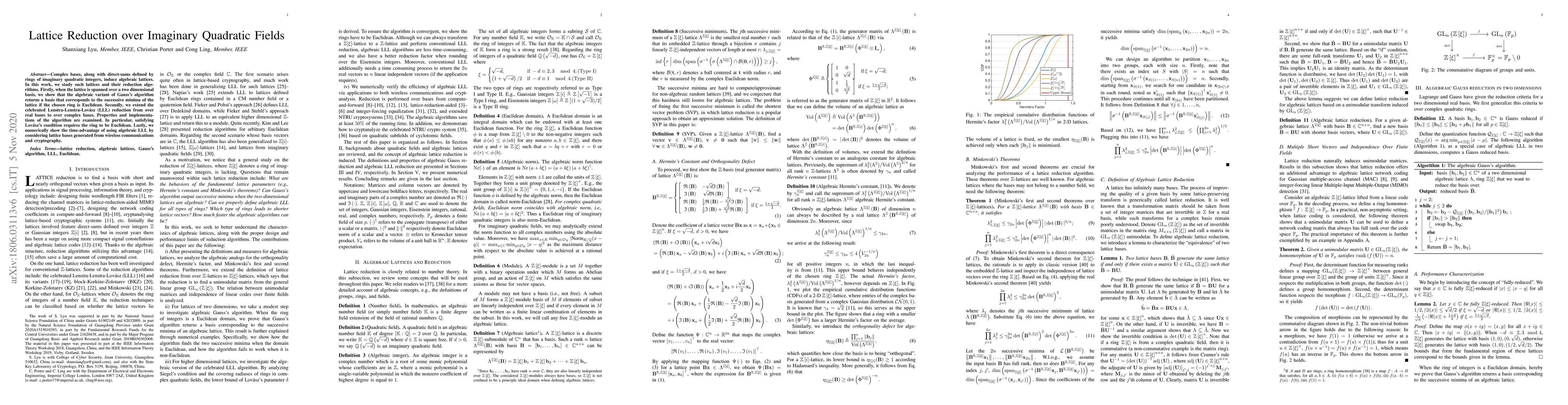This paper explores lattice reduction algorithms over imaginary quadratic fields, demonstrating the effectiveness of the algebraic variant of Gauss's algorithm and extending the LLL reduction to complex bases. It highlights the necessity of Euclidean rings for satisfying Lovasz's condition and showcases the practical benefits of the proposed methods in wireless communications and cryptography.