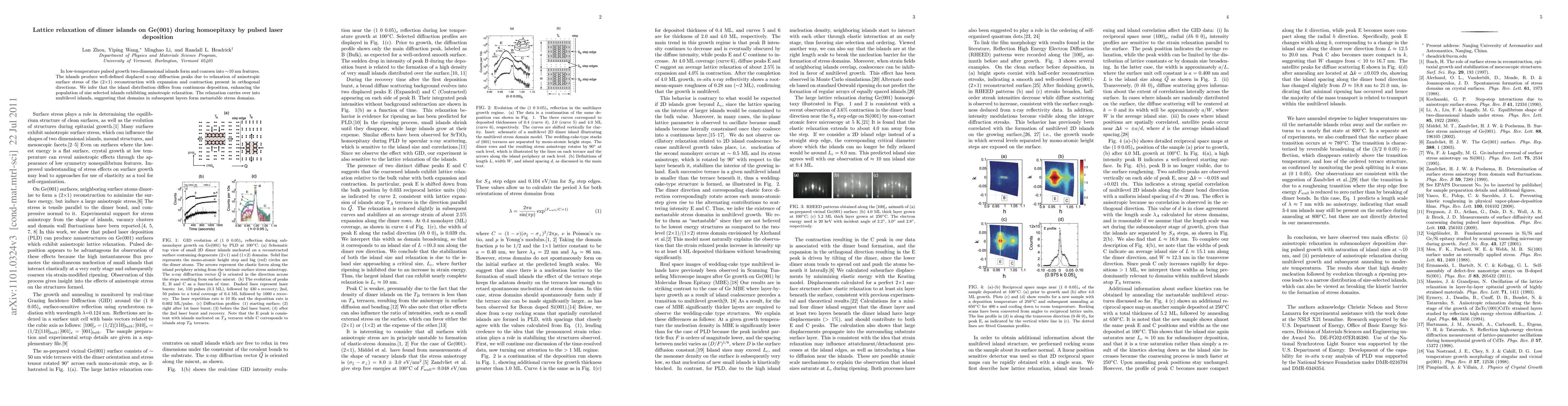 This study investigates the lattice relaxation of dimer islands on Ge(001) during pulsed laser deposition, revealing that islands undergo anisotropic relaxation due to surface stress, leading to distinct x-ray diffraction peaks. The relaxation persists in multilevel islands, indicating the formation of metastable stress domains.