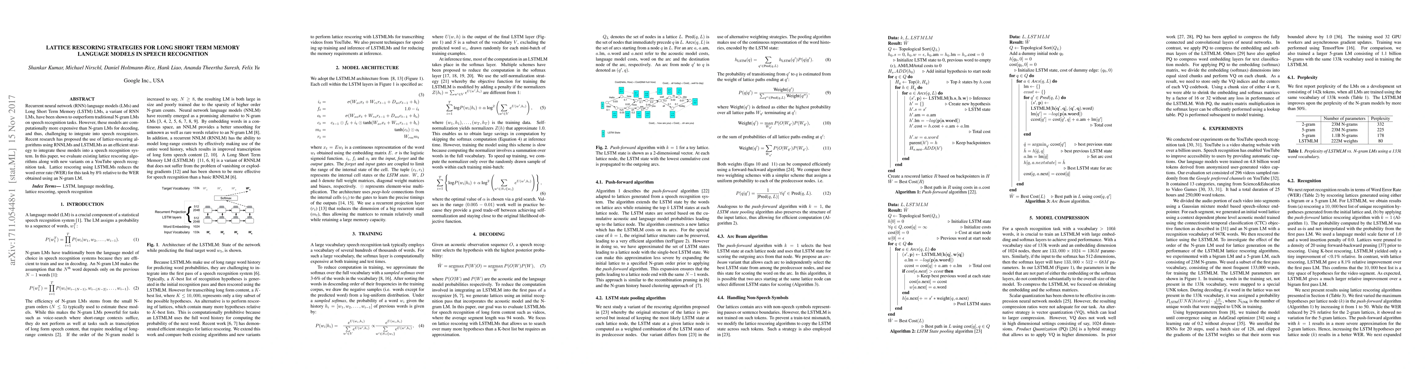 Recurrent neural network (RNN) language models (LMs) and Long Short Term Memory (LSTM) LMs, a variant of RNN LMs, have been shown to outperform traditional N-gram LMs on speech recognition tasks. However, these models are computationally more expensive than N-gram LMs for decoding, and thus, challenging to integrate into speech recognizers. Recent research has proposed the use of lattice-rescoring algorithms using RNNLMs and LSTMLMs as an efficient strategy to integrate these models into a speech recognition system. In this paper, we evaluate existing lattice rescoring algorithms along with new variants on a YouTube speech recognition task. Lattice rescoring using LSTMLMs reduces the word error rate (WER) for this task by 8\% relative to the WER obtained using an N-gram LM.