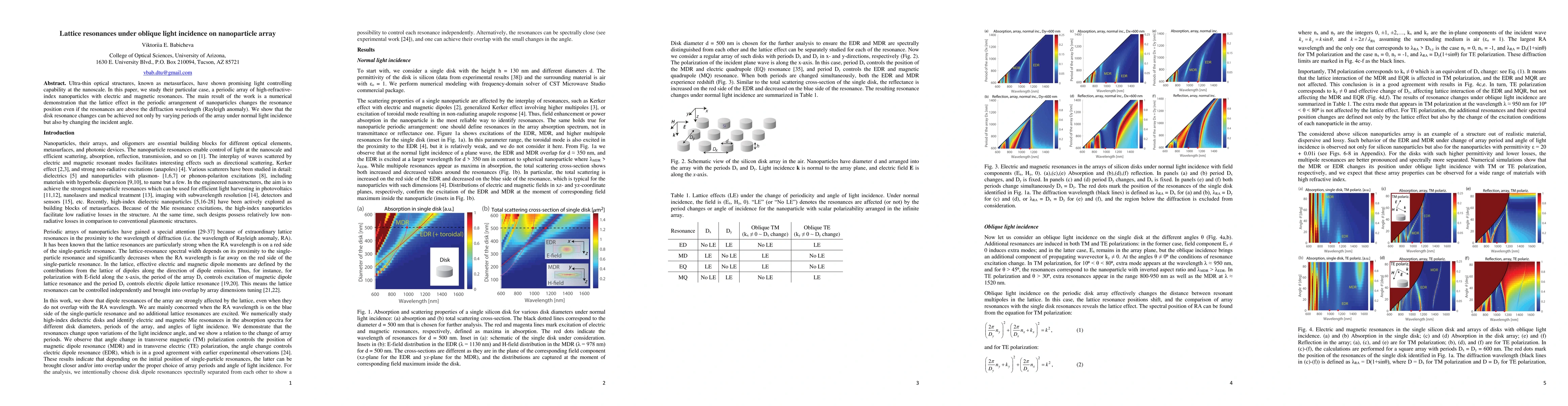 This paper investigates how lattice resonances in a periodic array of high-refractive-index nanoparticles alter their resonance positions under oblique light incidence, demonstrating that the effect persists even when resonances exceed the diffraction wavelength. The study reveals that changing the incident angle can shift the disk resonance, extending control beyond normal incidence.