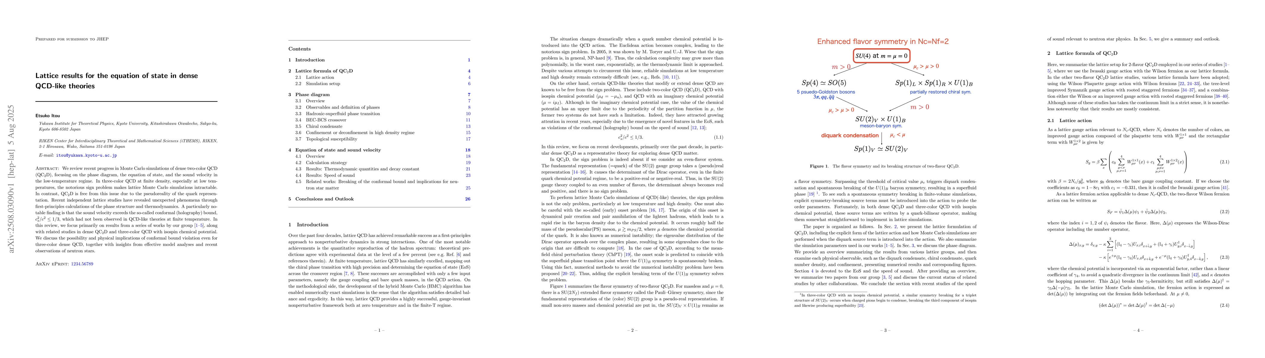 We review recent progress in Monte Carlo simulations of dense two-color QCD (QC$_2$D), focusing on the phase diagram, the equation of state, and the sound velocity in the low-temperature regime. In three-color QCD at finite density, especially at low temperatures, the notorious sign problem makes lattice Monte Carlo simulations intractable. In contrast, QC$_2$D is free from this issue due to the pseudoreality of the quark representation. Recent independent lattice studies have revealed unexpected phenomena through first-principles calculations of the phase structure and thermodynamics. A particularly notable finding is that the sound velocity exceeds the so-called conformal (holography) bound, \( c_s^2/c^2 \le 1/3 \), which had not been observed in QCD-like theories at finite temperature. In this review, we focus primarily on results from a series of works by our group~\cite{Iida:2019rah, Iida:2020emi,Iida:2022hyy, Ishiguro:2021yxr, Iida:2024irv}, along with related studies in dense QC$_2$D and three-color QCD with isospin chemical potential. We discuss the possibility and physical implications of conformal bound violation even for three-color dense QCD, together with insights from effective model analyses and recent observations of neutron stars.