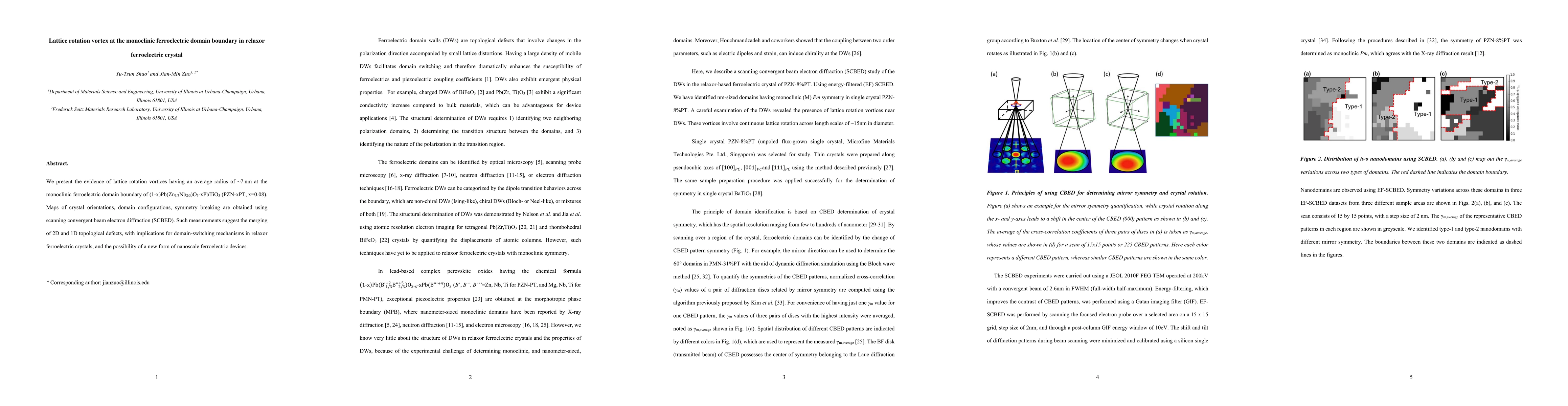We present the evidence of lattice rotation vortices having an average radius of ~7 nm at the monoclinic ferroelectric domain boundary of (1-x)Pb(Zn1/3Nb2/3)O3-xPbTiO3 (PZN-xPT, x=0.08). Maps of crystal orientations, domain configurations, symmetry breaking are obtained using scanning convergent beam electron diffraction (SCBED). Such measurements suggest the merging of 2D and 1D topological defects, with implications for domain-switching mechanisms in relaxor ferroelectric crystals, and the possibility of a new form of nanoscale ferroelectric devices.