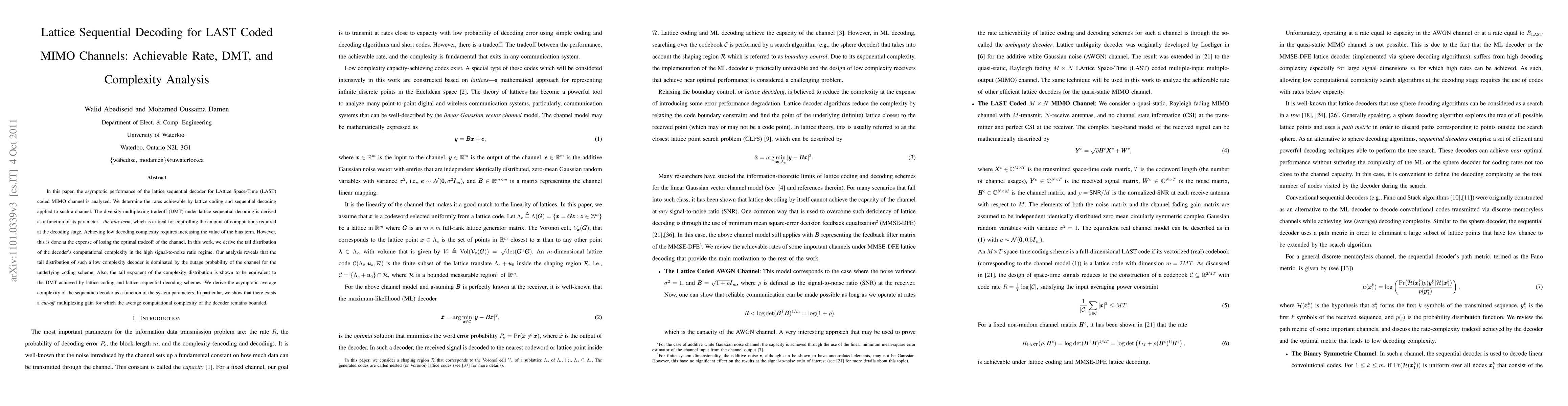 This paper analyzes the asymptotic performance of lattice sequential decoding for LAST coded MIMO channels, determining achievable rates and deriving the diversity-multiplexing tradeoff (DMT). It finds that increasing the bias term for lower complexity sacrifices optimal channel tradeoff, and reveals a connection between the tail distribution of decoder complexity and channel outage probability.