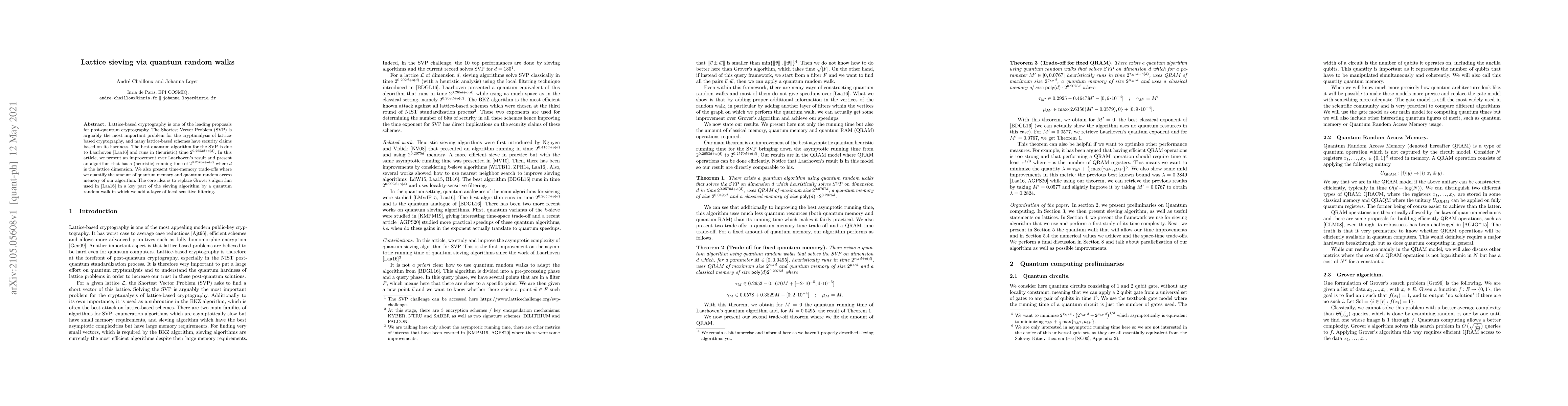 The research presents an improvement over Laarhoven's algorithm for the Shortest Vector Problem (SVP) in lattice-based cryptography using quantum random walks, resulting in a heuristic quantum algorithm with a running time of $2^{0.2570 d + o(d)}$ for SVP.