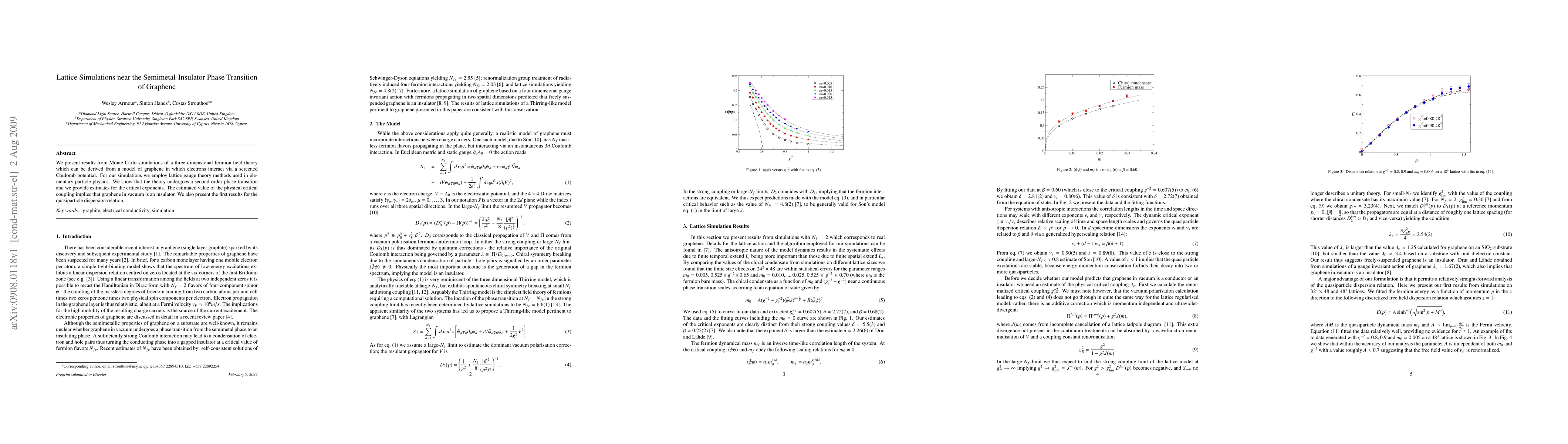 We present results from Monte Carlo simulations of a three dimensional fermionic field theory which can be derived from a model of graphene in which electrons interact via a screened Coulomb potential. For our simulations we employ lattice gauge theory methods used in elementary particle physics. We show that the theory undergoes a second order phase transition and we provide estimates for the critical exponents. The estimated value of the physical critical coupling implies that graphene in vacuum is an insulator. We also present the first results for the quasiparticle dispersion relation.
