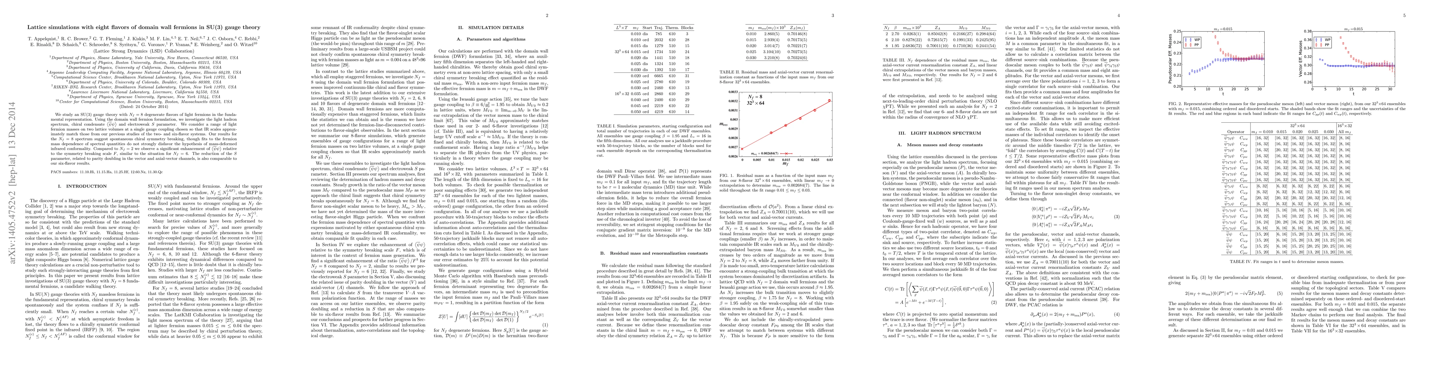 This study uses lattice simulations with eight flavors of domain wall fermions in SU(3) gauge theory to investigate the light hadron spectrum, chiral condensate, and electroweak S parameter. Results indicate spontaneous chiral symmetry breaking and a significant enhancement of the chiral condensate relative to previous two-flavor studies, with a reduction in the S parameter similar to six-flavor results.