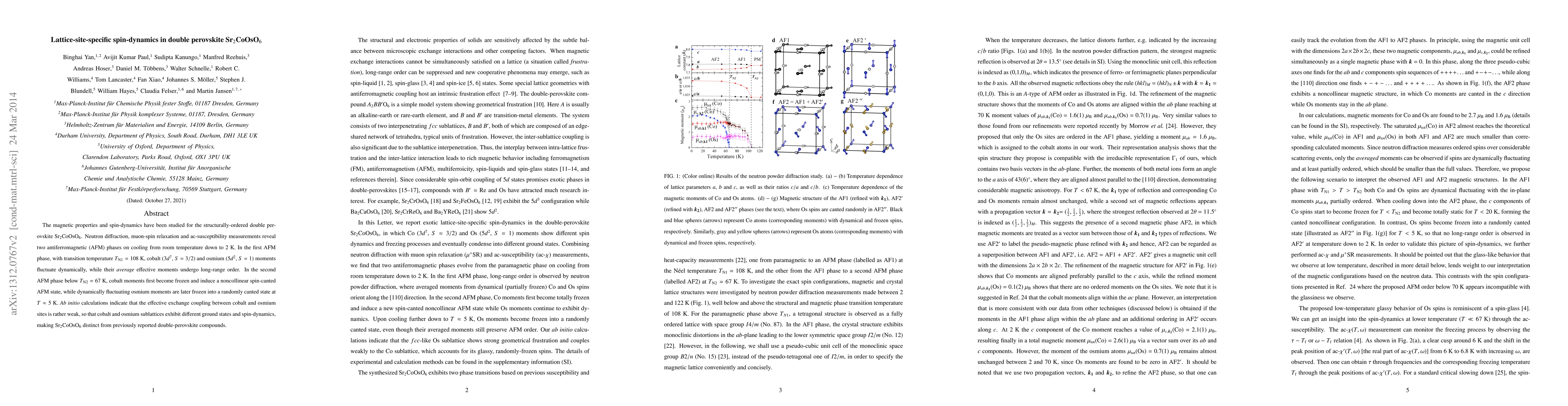 The study of Sr2CoOsO6, a double perovskite, reveals two antiferromagnetic phases with distinct spin-dynamics. Cobalt and osmium moments exhibit different behaviors, with cobalt moments fluctuating dynamically and freezing, while osmium moments remain fluctuating until low temperatures, where they freeze in a randomly canted state. Ab initio calculations suggest weak exchange coupling between cobalt and osmium, making Sr2CoOsO6 unique compared to other double-perovskite compounds.