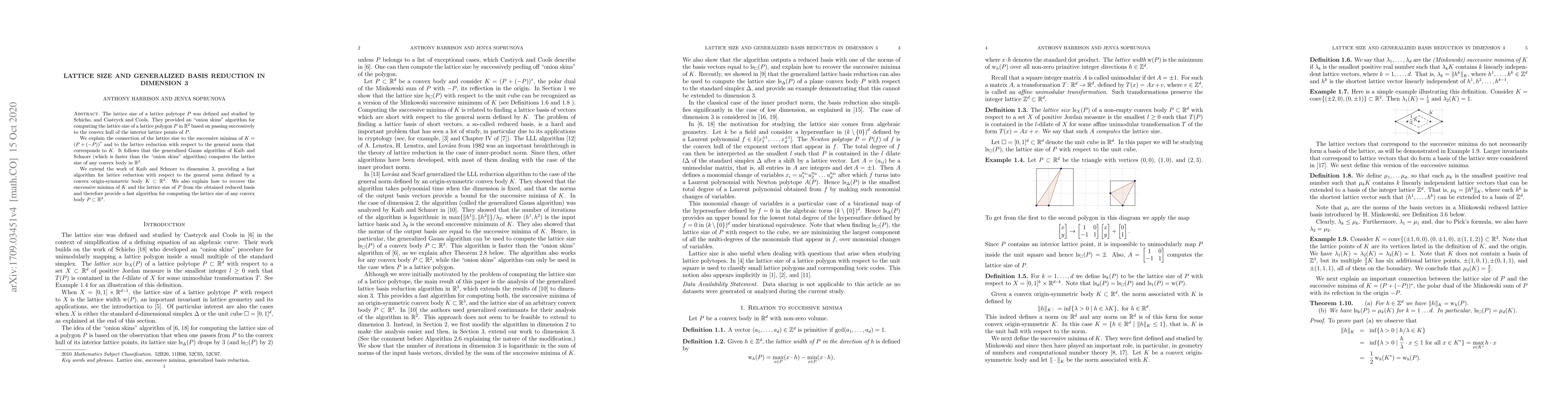 This paper connects the lattice size of a lattice polytope to the successive minima of its associated convex body and lattice reduction algorithms. It extends the generalized Gauss algorithm to dimension 3, providing a fast method for computing the lattice size of any convex body in $\mathbb{R}^3$ by using the reduced basis.