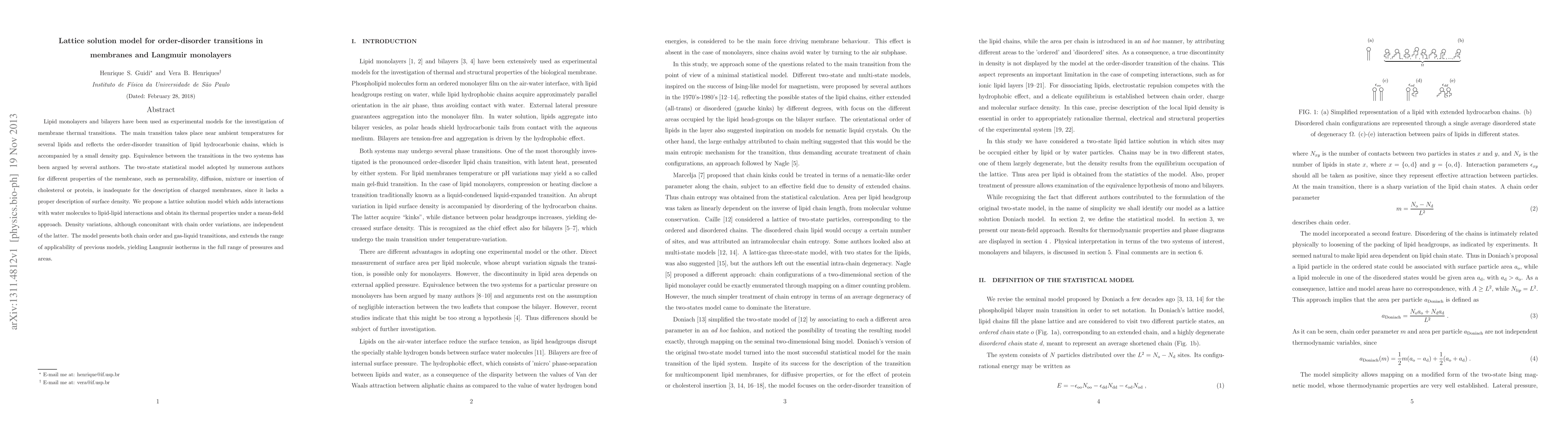 Lipid monolayers and bilayers have been used as experimental models for the investigation of membrane thermal transitions. The main transition takes place near ambient temperatures for several lipids and reflects the order-disorder transition of lipid hydrocarbonic chains, which is accompanied by a small density gap. Equivalence between the transitions in the two systems has been argued by several authors. The two-state statistical model adopted by numerous authors for different properties of the membrane, such as permeability, diffusion, mixture or insertion of cholesterol or protein, is inadequate for the description of charged membranes, since it lacks a proper description of surface density. We propose a lattice solution model which adds interactions with water molecules to lipid-lipid interactions and obtain its thermal properties under a mean-field approach. Density variations, although concomitant with chain order variations, are independent of the latter. The model presents both chain order and gas-liquid transitions, and extends the range of applicability of previous models, yielding Langmuir isotherms in the full range of pressures and areas.