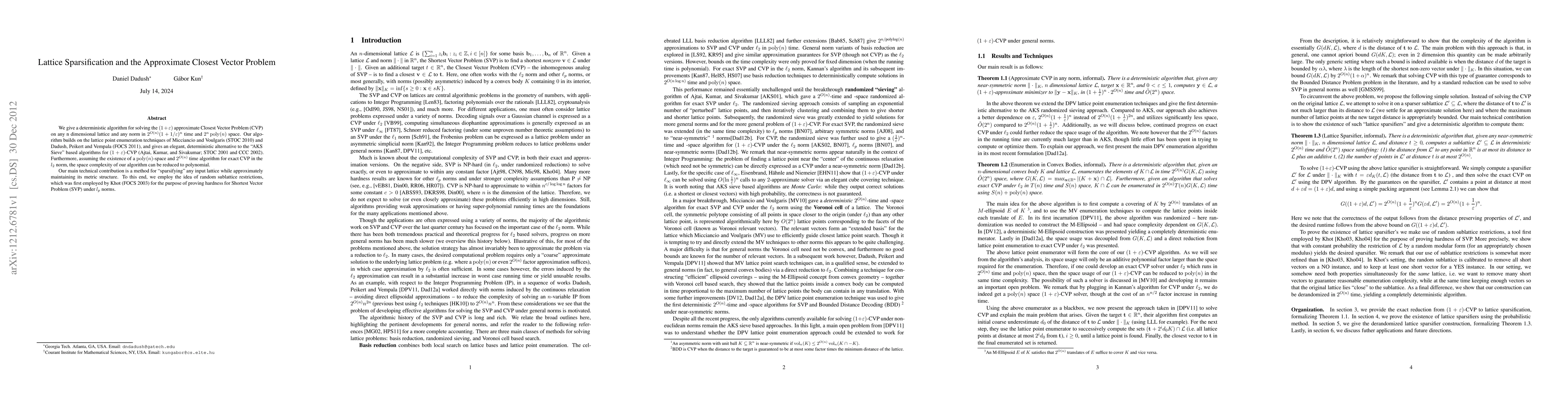 This paper presents a deterministic algorithm for solving the (1+eps)-approximate Closest Vector Problem (CVP) on n-dimensional lattices, achieving a time complexity of 2^{O(n)}(1+1/eps)^n and a space complexity of 2^n poly(n). The algorithm employs lattice sparsification techniques to maintain metric structure while reducing complexity.