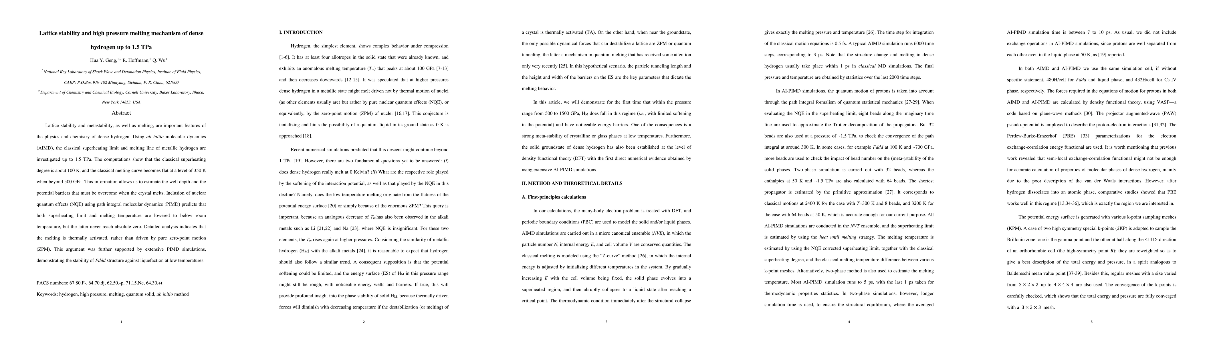 This paper investigates the lattice stability and melting mechanism of dense hydrogen under extreme pressures up to 1.5 TPa using ab initio and path integral molecular dynamics. Classical superheating is found to be around 100 K, while nuclear quantum effects lower the melting temperature below room temperature, indicating thermal activation rather than zero-point motion drives melting.