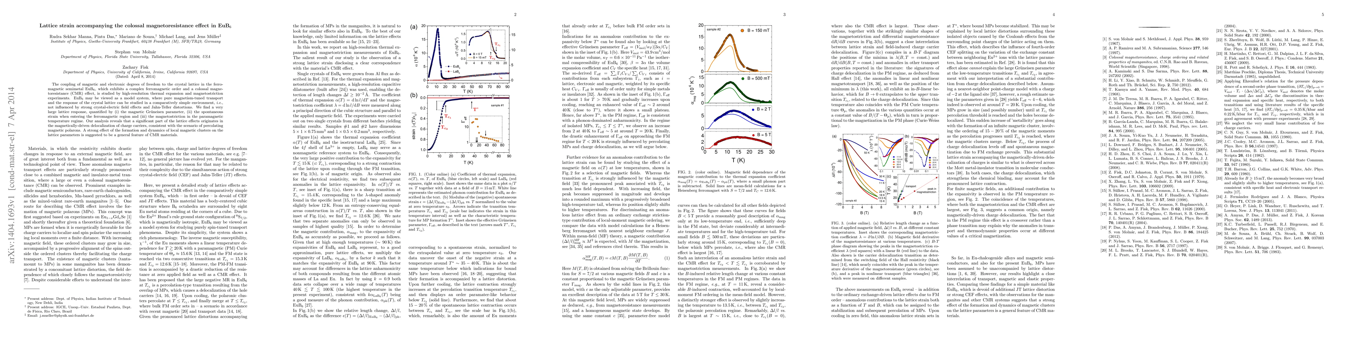 The coupling of magnetic and electronic degrees of freedom to the crystal lattice in the ferromagnetic semimetal EuB$_6$, which exhibits a complex ferromagnetic order and a colossal magnetoresistance (CMR) effect, %, very likely involving magnetic polarons, is studied by high-resolution thermal expansion and magnetostriction experiments. EuB$_6$ may be viewed as a model system, where pure magnetism-tuned transport and the response of the crystal lattice can be studied in a comparatively simple environment,i.e., not influenced by strong crystal-electric field effects and Jahn-Teller distortions. We find a very large lattice response, quantified by (i) the magnetic Gr\"uneisen parameter, (ii) the spontaneous strain when entering the ferromagnetic region and (iii) the magnetostriction in the paramagnetic temperature regime. Our analysis reveals that a significant part of the lattice effects originates in the magnetically-driven delocalization of charge carriers, consistent with the scenario of percolating magnetic polarons. A strong effect of the formation and dynamics of local magnetic clusters on the lattice parameters is suggested to be a general feature of CMR materials.