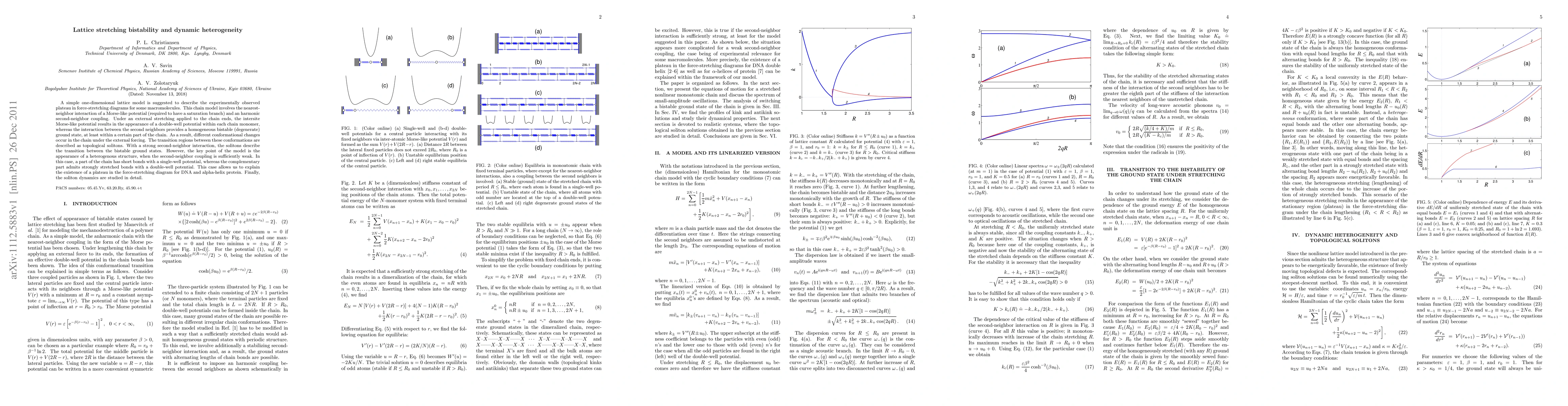 A simple one-dimensional lattice model is suggested to describe the experimentally observed plateau in force-stretching diagrams for some macromolecules. This chain model involves the nearest-neighbor interaction of a Morse-like potential (required to have a saturation branch) and an harmonic second-neighbor coupling. Under an external stretching applied t o the chain ends, the intersite Morse-like potential results in the appearance of a double-well potential within each chain monomer, whereas the interaction between the second neighbors provide s a homogeneous bistable (degenerate) ground state, at least within a certain part of the chain. As a result, different conformational changes occur in the chain under the external forcing. The transition regions between these conformations are described as topological solitons. With a strong second-neighbor interaction, the solitons describe the transition between the bistable ground states. However, the key point of the model is the appearance of a heterogenous structure, when the second-neighbor coupling is sufficiently weak. In this case, a part of the chain has short bonds with a single-well potential, whereas the complementary part admits strongly stretched bonds with a double-well potential. This case allows us to explain the existence of a plateau in the force-stretching diagram for DNA and alpha-helix protein. Finally, the soliton dynamics are studied in detail.
