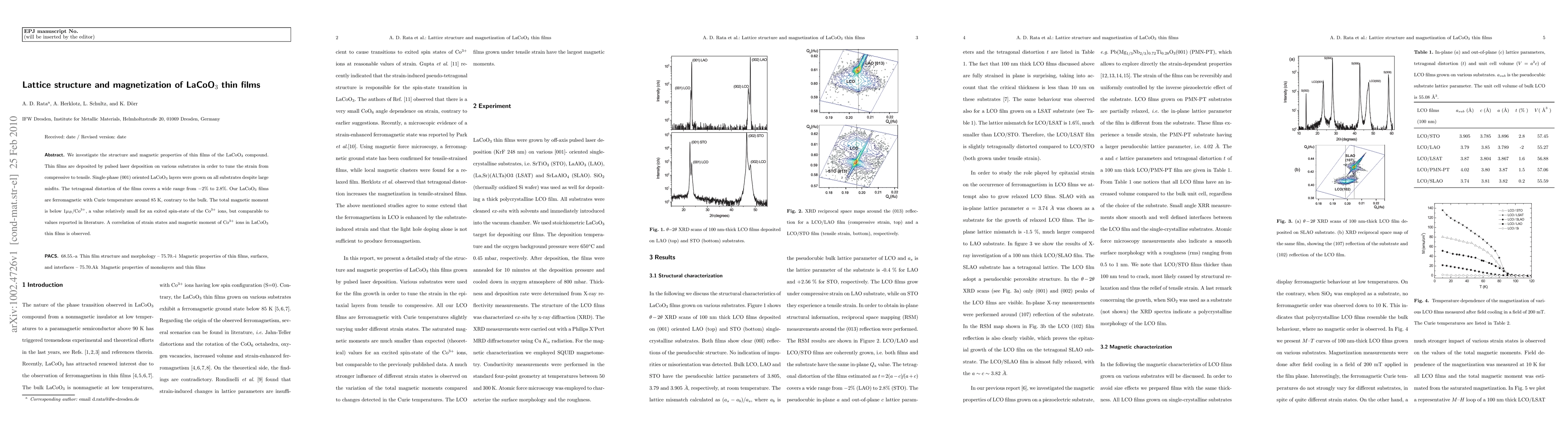 We investigate the structure and magnetic properties of thin films of the LaCoO$_{3}$ compound. Thin films are deposited by pulsed laser deposition on various substrates in order to tune the strain from compressive to tensile. Single-phase (001) oriented LaCoO$_{3}$ layers were grown on all substrates despite large misfits. The tetragonal distortion of the films covers a wide range from -2% to 2.8%. Our LaCoO$_{3}$ films are ferromagnetic with Curie temperature around 85 K, contrary to the bulk. The total magnetic moment is below $1\mu_{B}$/Co$^{3+}$, a value relatively small for an exited spin-state of the Co$^{3+}$ ions, but comparable to values reported in literature. A correlation of strain states and magnetic moment of Co$^{3+}$ ions in LaCoO$_{3}$ thin films is observed.