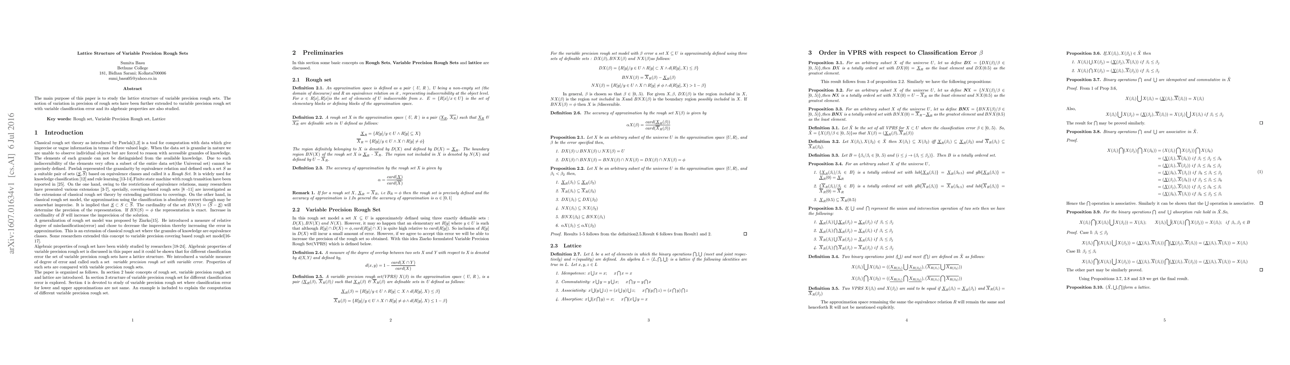 Summary: This paper investigates the lattice structure of variable precision rough sets, extending the concept of varying precision to account for variable classification error and examining its algebraic properties.