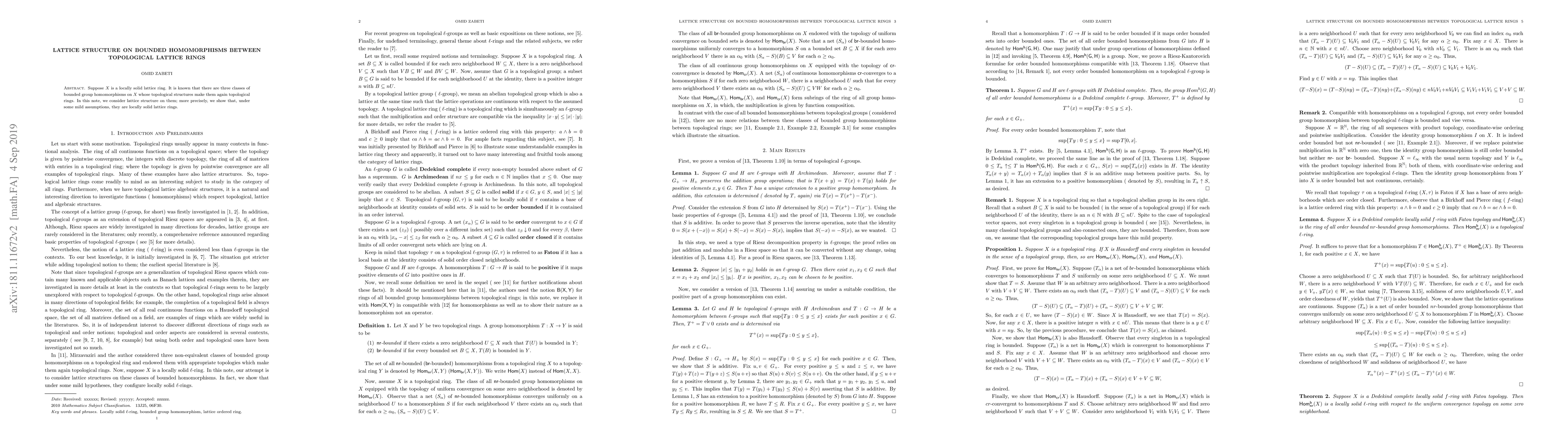 Summary: This paper investigates the lattice structure on bounded homomorphisms between locally solid lattice rings, demonstrating that under mild assumptions, these homomorphisms form locally solid lattice rings themselves. The focus is on the topological and lattice properties of these homomorphisms.