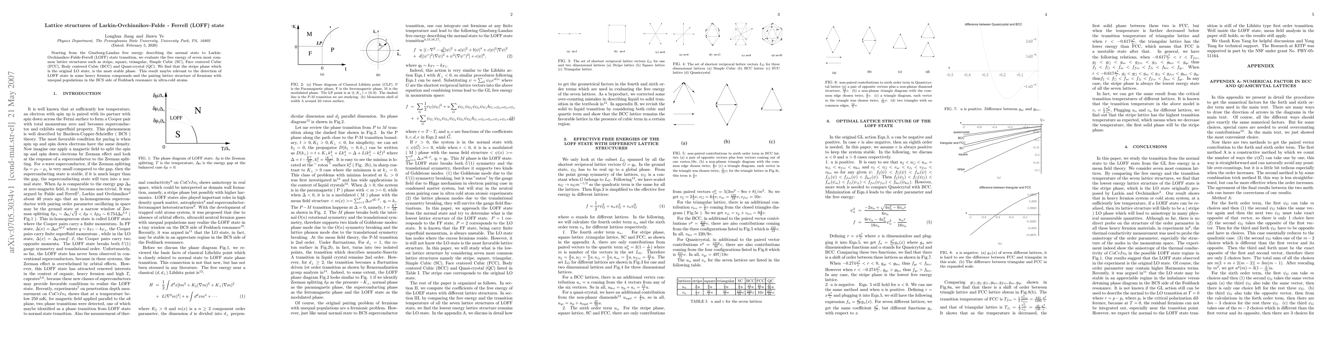 Starting from the Ginzburg-Landau free energy describing the normal state to Larkin-Ovchinnikov-Fulde-Ferrell (LOFF) state transition, we evaluate the free energy of seven most common lattice structures such as stripe, square, triangular,Simple Cubic (SC), Face centered Cubic (FCC),Body centered Cubic (BCC) and Quasi-crystal (QC). We find that the stripe phase which is the original LO state, is the most stable phase. This result maybe relevant to the detection of LOFF state in some heavy fermion compounds and the pairing lattice structure of fermions with unequal populations in the BCS side of Feshbach resonance in ultra-cold atoms.
