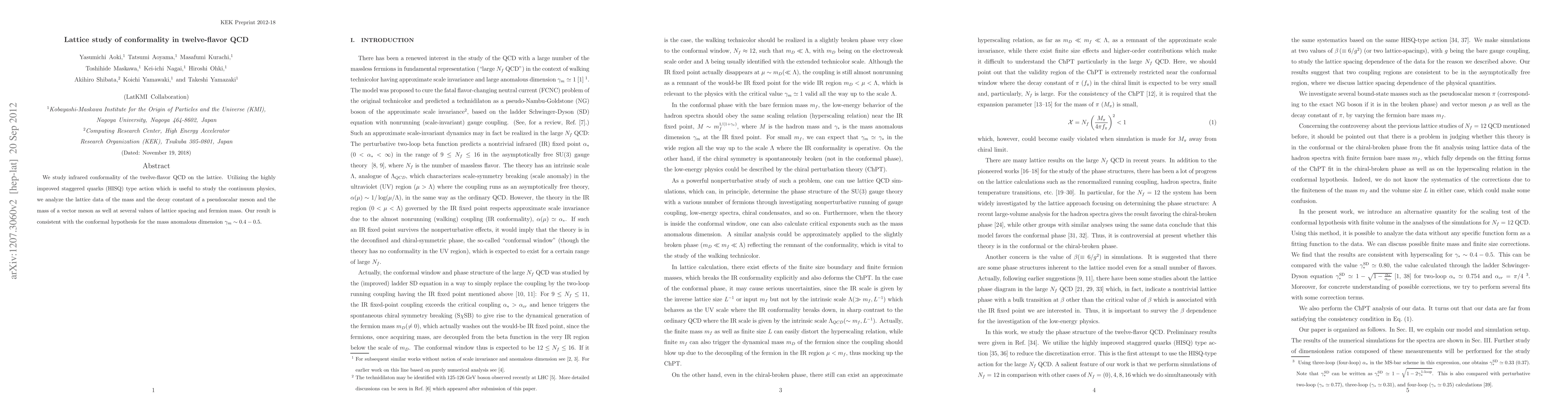 We study infrared conformality of the twelve-flavor QCD on the lattice. Utilizing the highly improved staggered quarks (HISQ) type action which is useful to study the continuum physics, we analyze the lattice data of the mass and the decay constant of a pseudoscalar meson and the mass of a vector meson as well at several values of lattice spacing and fermion mass. Our result is consistent with the conformal hypothesis for the mass anomalous dimension $\gamma_m \sim 0.4-0.5$.