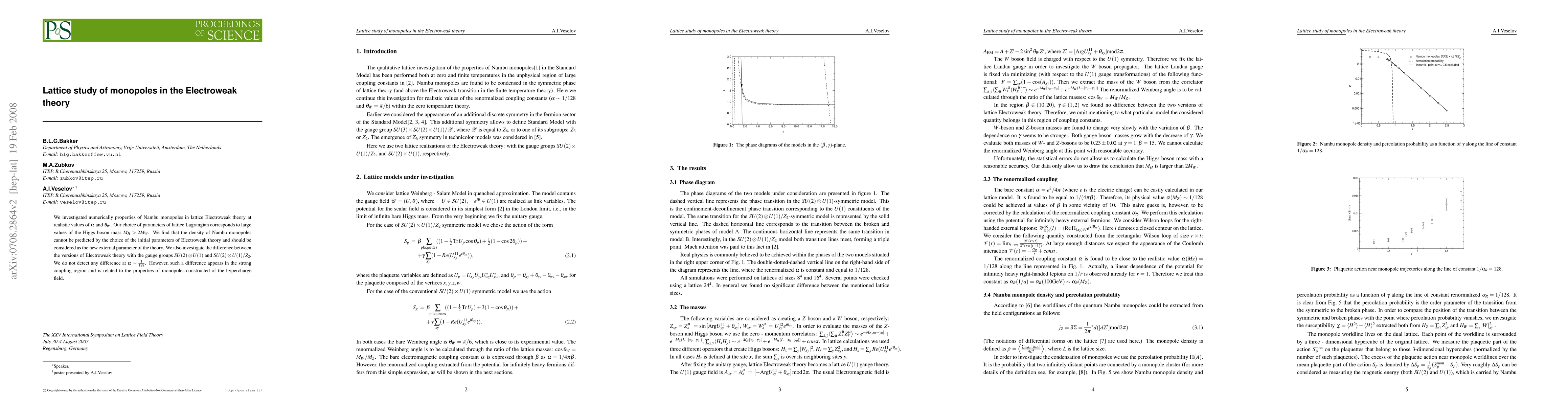 The research numerically investigates properties of Nambu monopoles in lattice Electroweak theory at realistic values of α and θ_W, using two lattice realizations of the Electroweak theory with gauge groups SU(2)⊗U(1)/Z_2 and SU(2)⊗U(1).