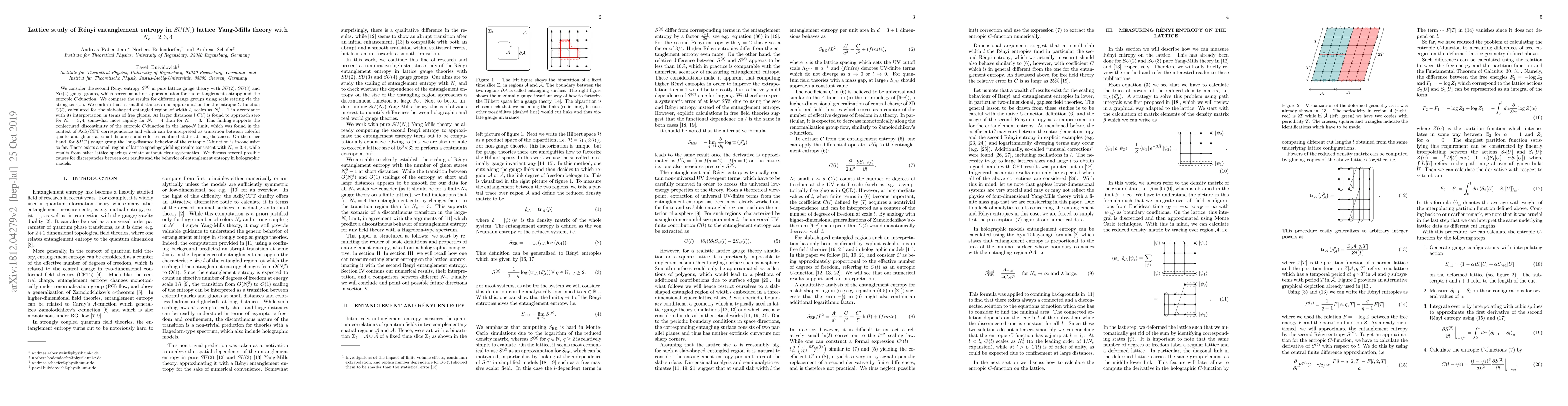 We consider the second R\'enyi entropy $S^{(2)}$ in pure lattice gauge theory with $SU(2)$, $SU(3)$ and $SU(4)$ gauge groups, which serves as a first approximation for the entanglement entropy and the entropic $C$-function. We compare the results for different gauge groups using scale setting via the string tension. We confirm that at small distances $l$ our approximation for the entropic $C$-function $C(l)$, calculated for the slab-shaped entangled region of width $l$, scales as $N_c^2 - 1$ in accordance with its interpretation in terms of free gluons. At larger distances $l$ $C(l)$ is found to approach zero for $N_c = 3, 4$, somewhat more rapidly for $N_c = 4$ than for $N_c = 3$. This finding supports the conjectured discontinuity of the entropic $C$-function in the large-$N$ limit, which was found in the context of AdS/CFT correspondence and which can be interpreted as transition between colorful quarks and gluons at small distances and colorless confined states at long distances. On the other hand, for $SU(2)$ gauge group the long-distance behavior of the entropic $C$-function is inconclusive so far. There exists a small region of lattice spacings yielding results consistent with $N_c=3,4$, while results from other lattice spacings deviate without clear systematics. We discuss several possible causes for discrepancies between our results and the behavior of entanglement entropy in holographic models.